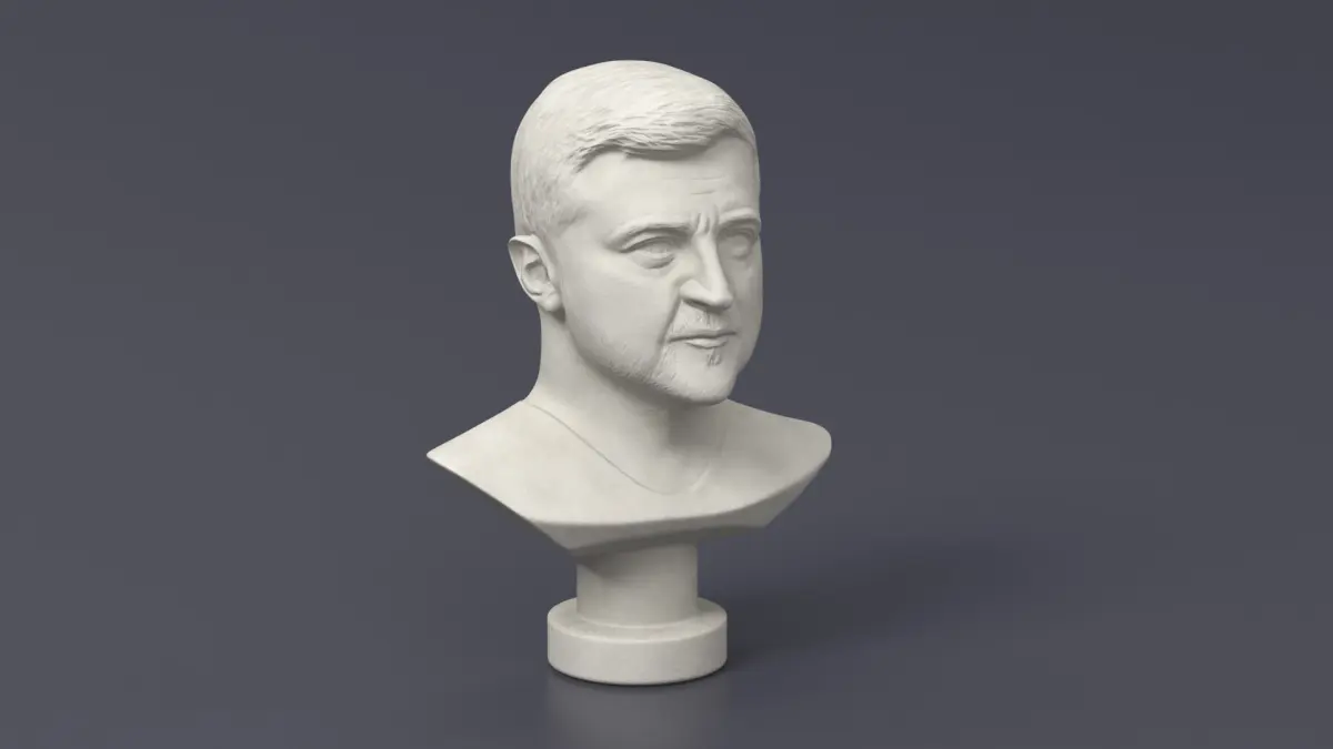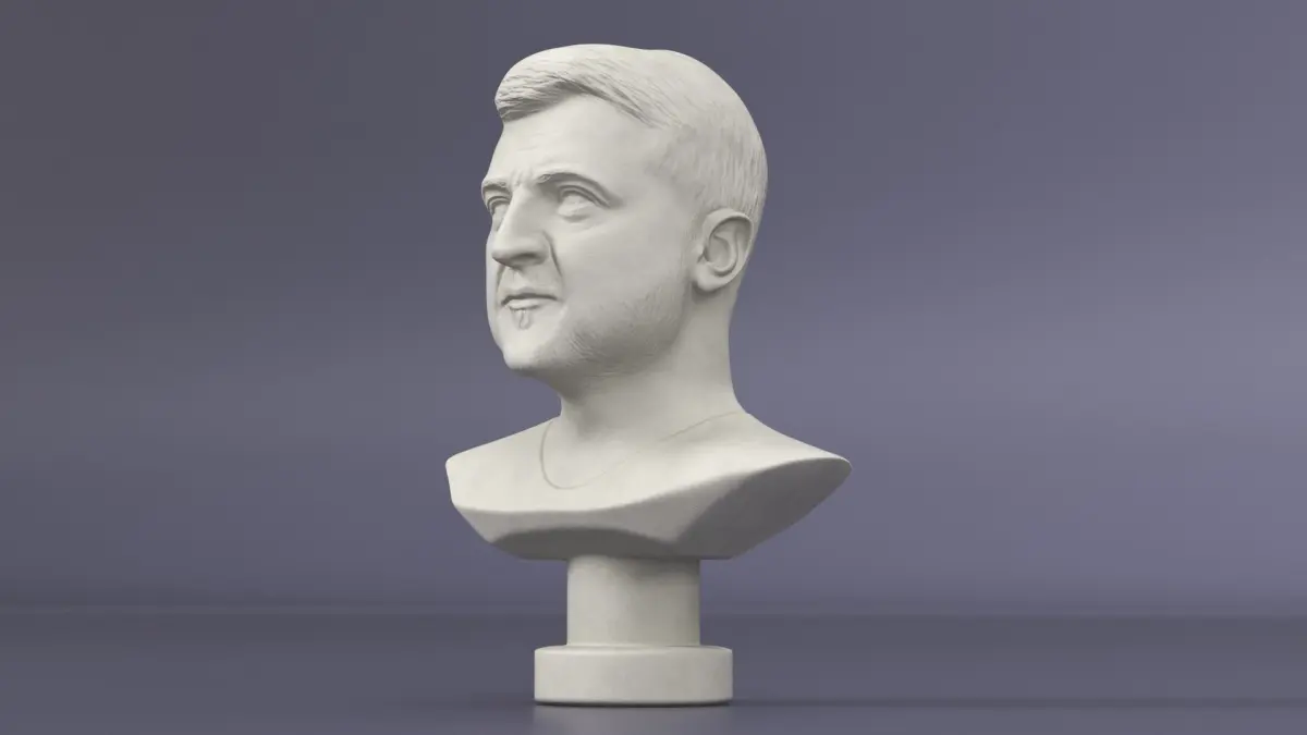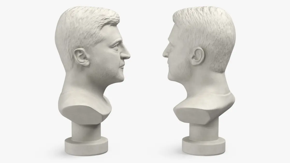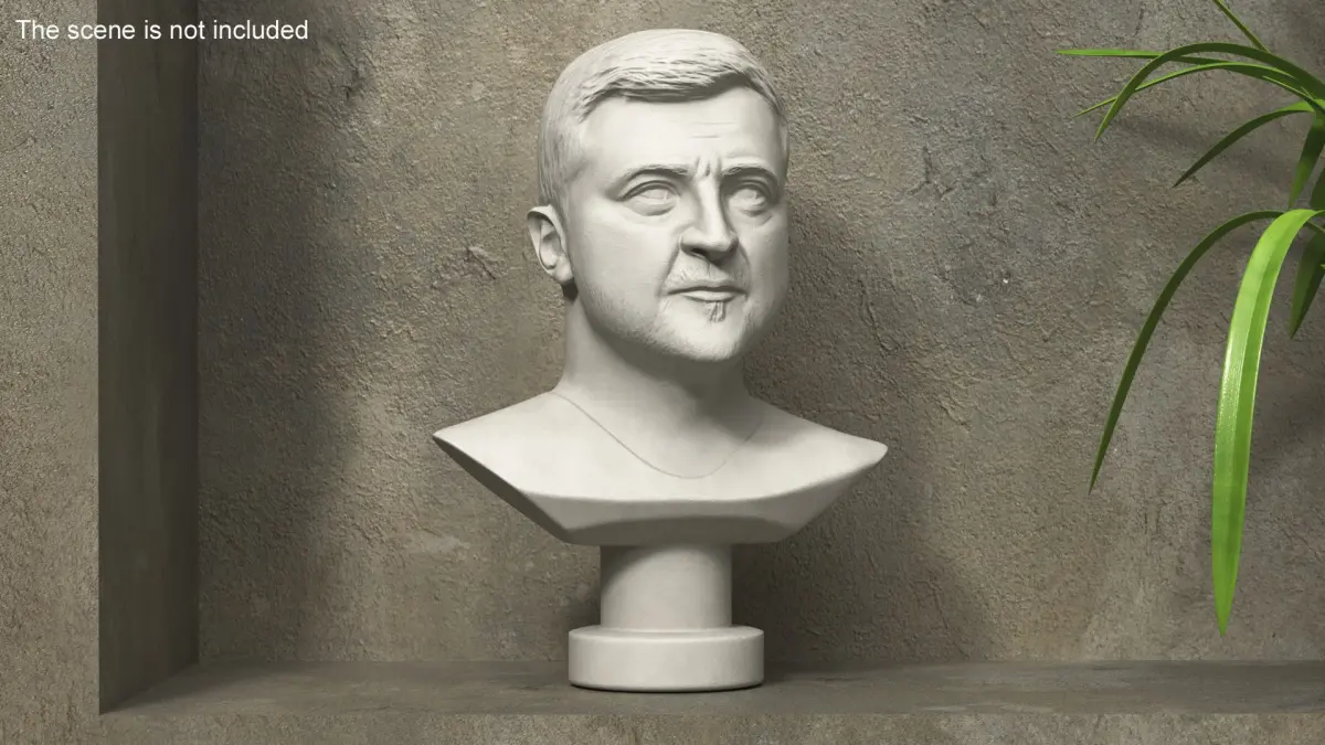 Plaster Bust of Zelensky is a 3D model of a sculpted representation of Volodymyr Zelensky, capturing his likeness in a classical bust style.