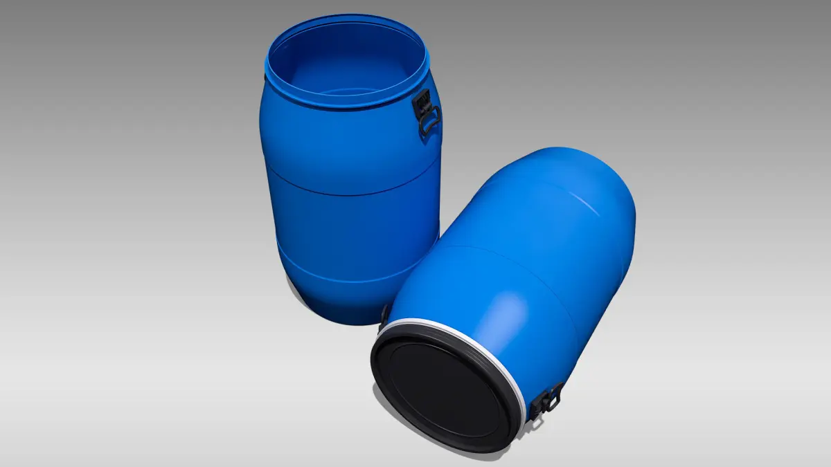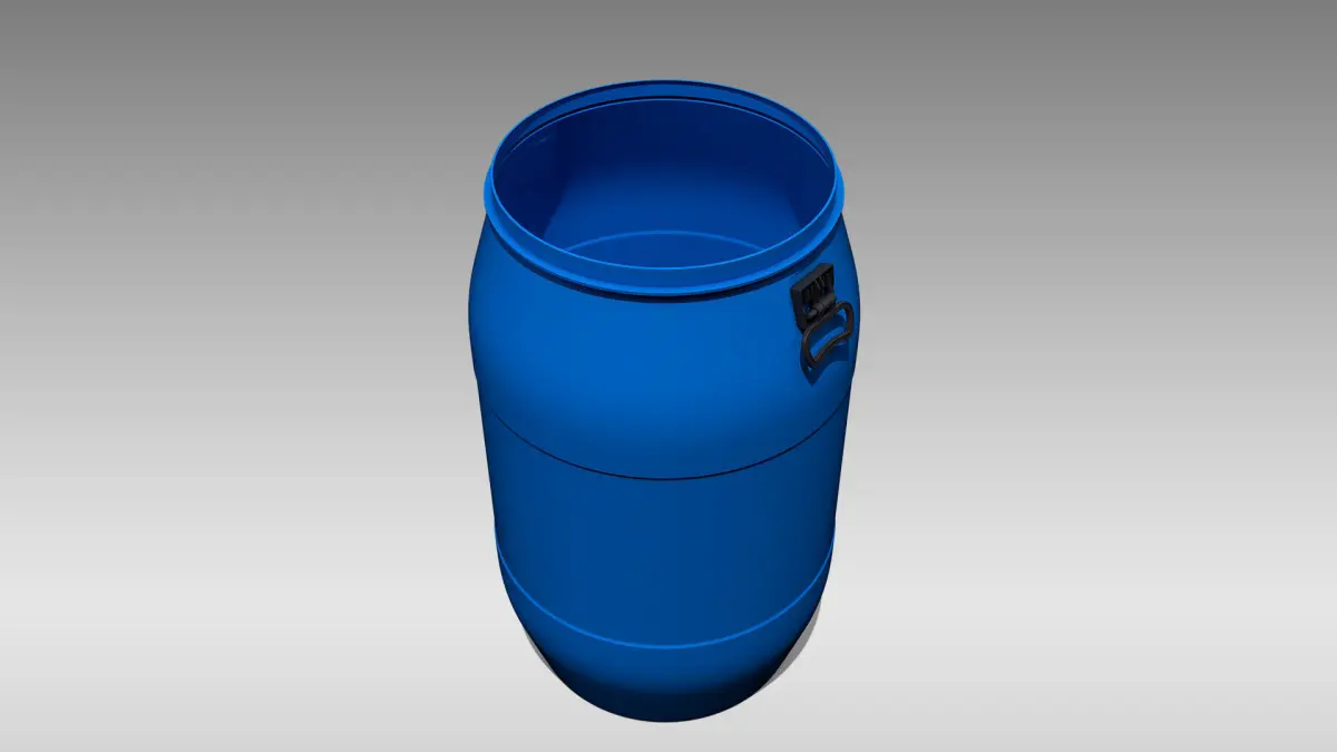 Detailed 3D model of an open-top plastic barrel, modeled and rendered in Cinema 4D. The model was created using approximate real world dimensions.