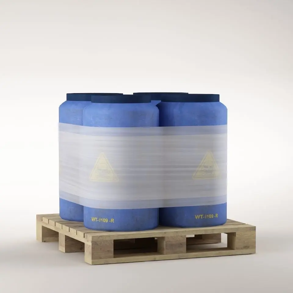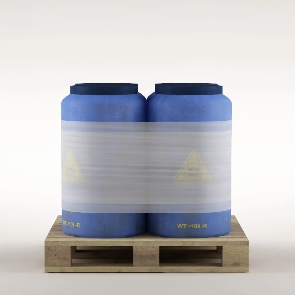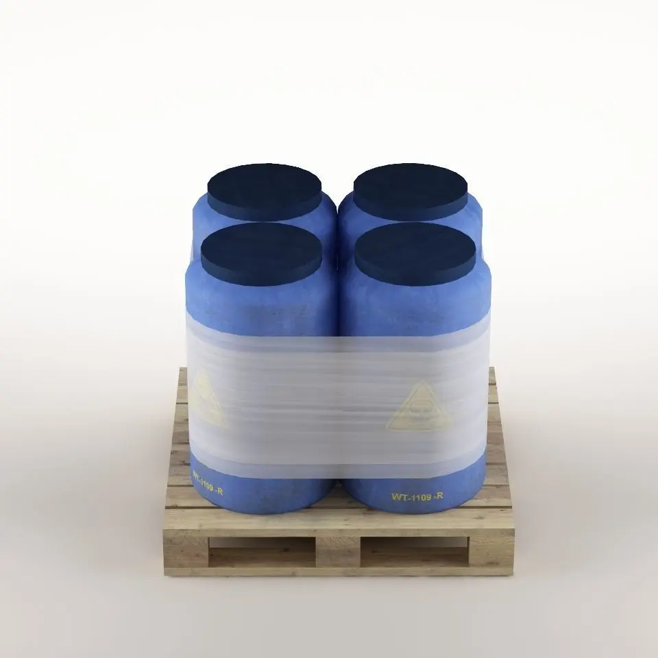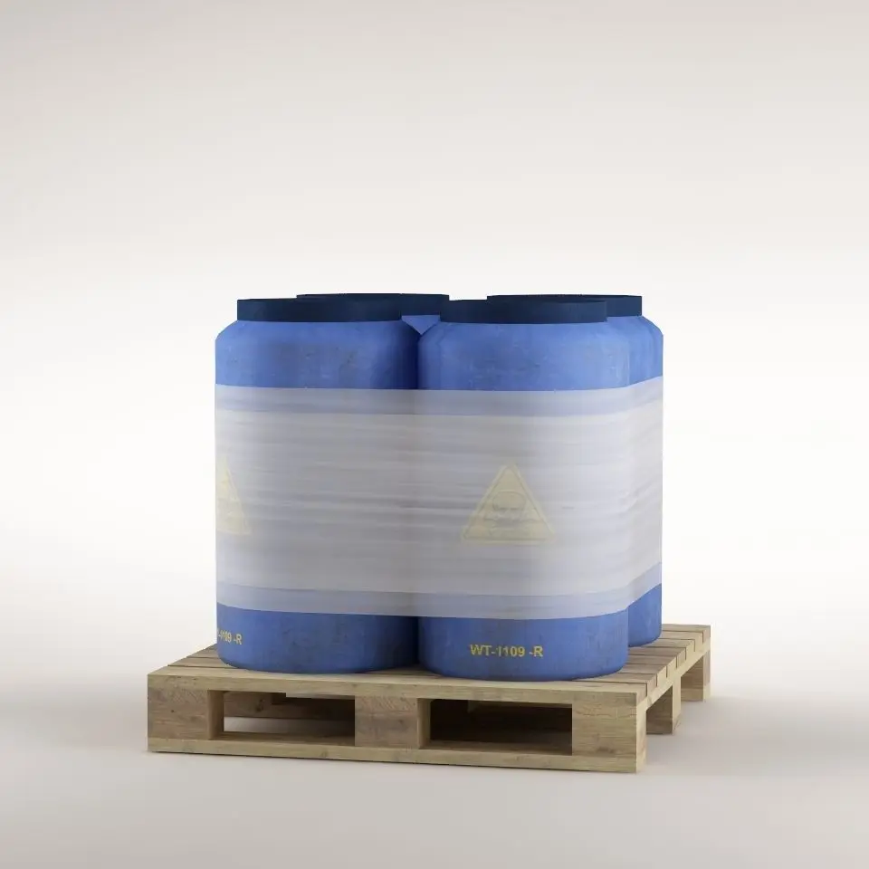 Lowpoly four plastic barrels placed on a wooden pallet wrapped in plastic foil.