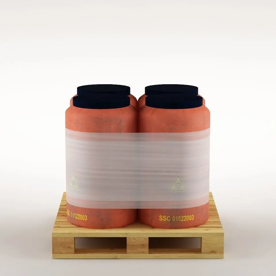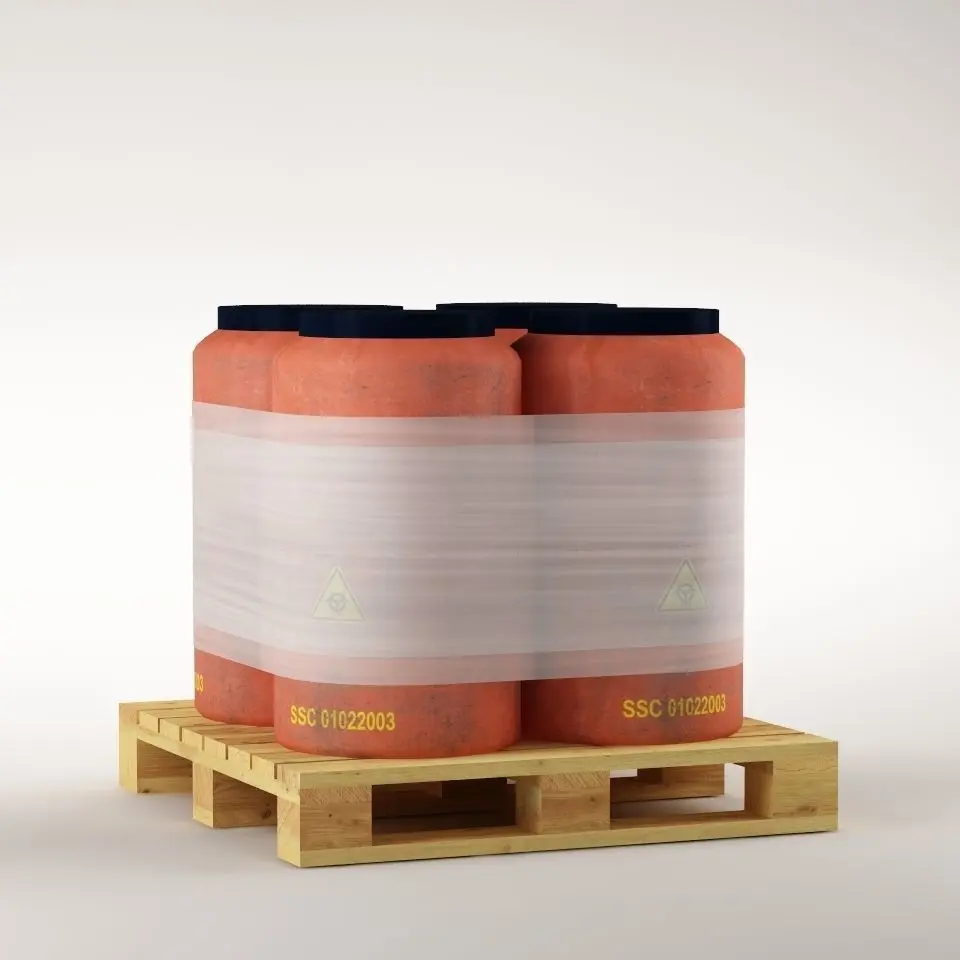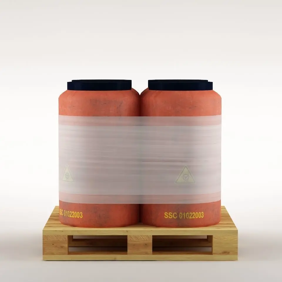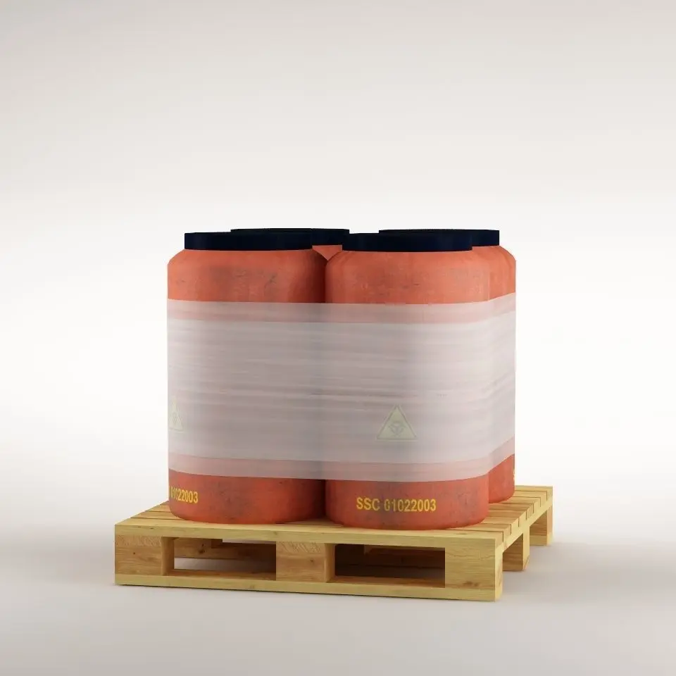 Lowpoly four plastic barrels placed on a wooden pallet wrapped in plastic foil