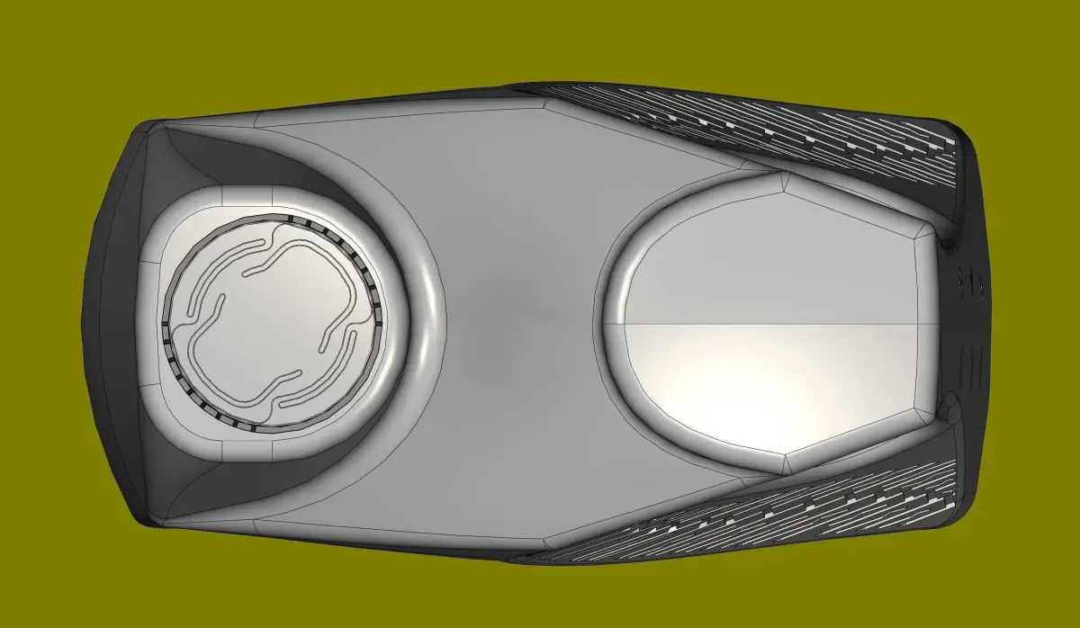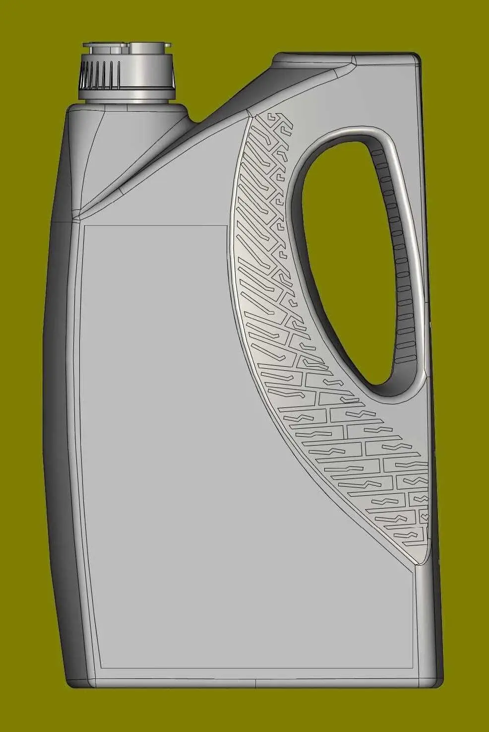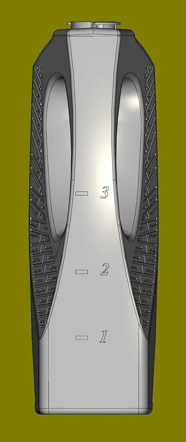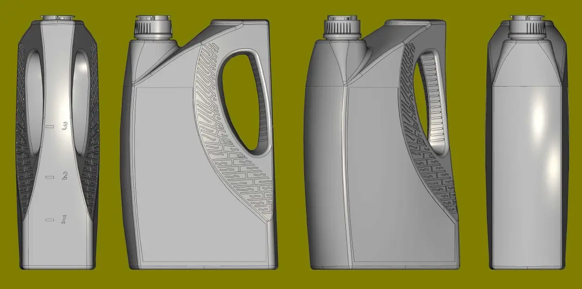 Please familiarize yourself with the history and parameters of the model in detail.The neck, f38mm, adjoins one of the sides. On the opposite side there is a flat area. They are connected to each other by a radius slope. Under the flat area, on the opposite side from the neck, I made a handle. On one side, I equipped the handle with elements of a car tire. On the other side, I equipped the handle with ribs from slipping. On the side of the handle, on the side surface, I placed a scale for approximately measuring the oil level in the canister. In the front and back there are depressions for stickers. The bottom of the canister is equipped with stiffening ribs from sagging.