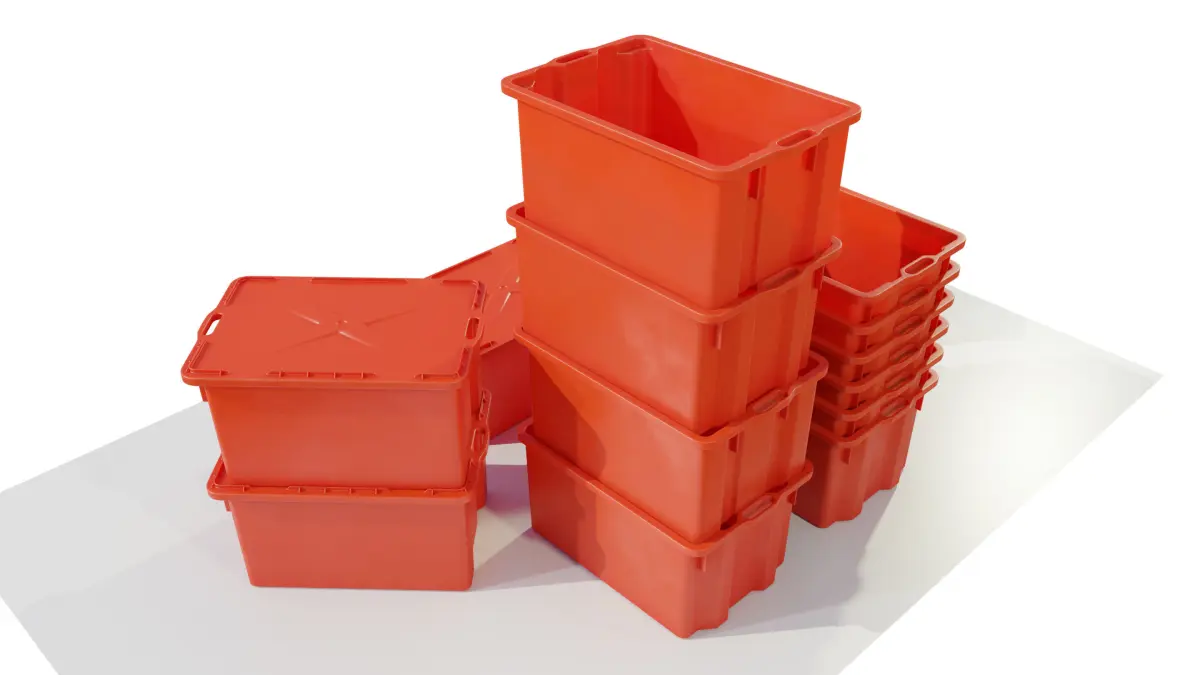 Plastic crates for vegetables and fruit ready for rendering.