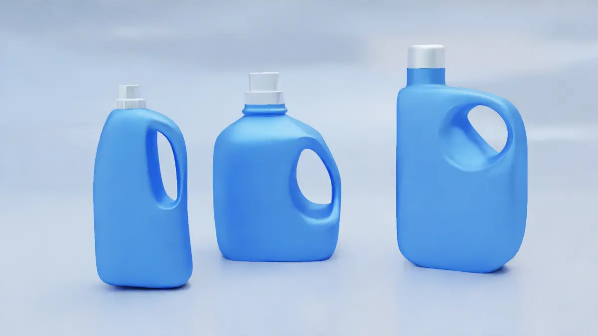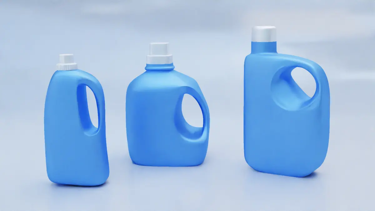 This is a high-quality 3D model of a plastic detergent bottle set, ideal for product packaging visualization, branding design, and advertising. The set includes 3 different shapes and sizes, each with ergonomic handles and realistic plastic caps.