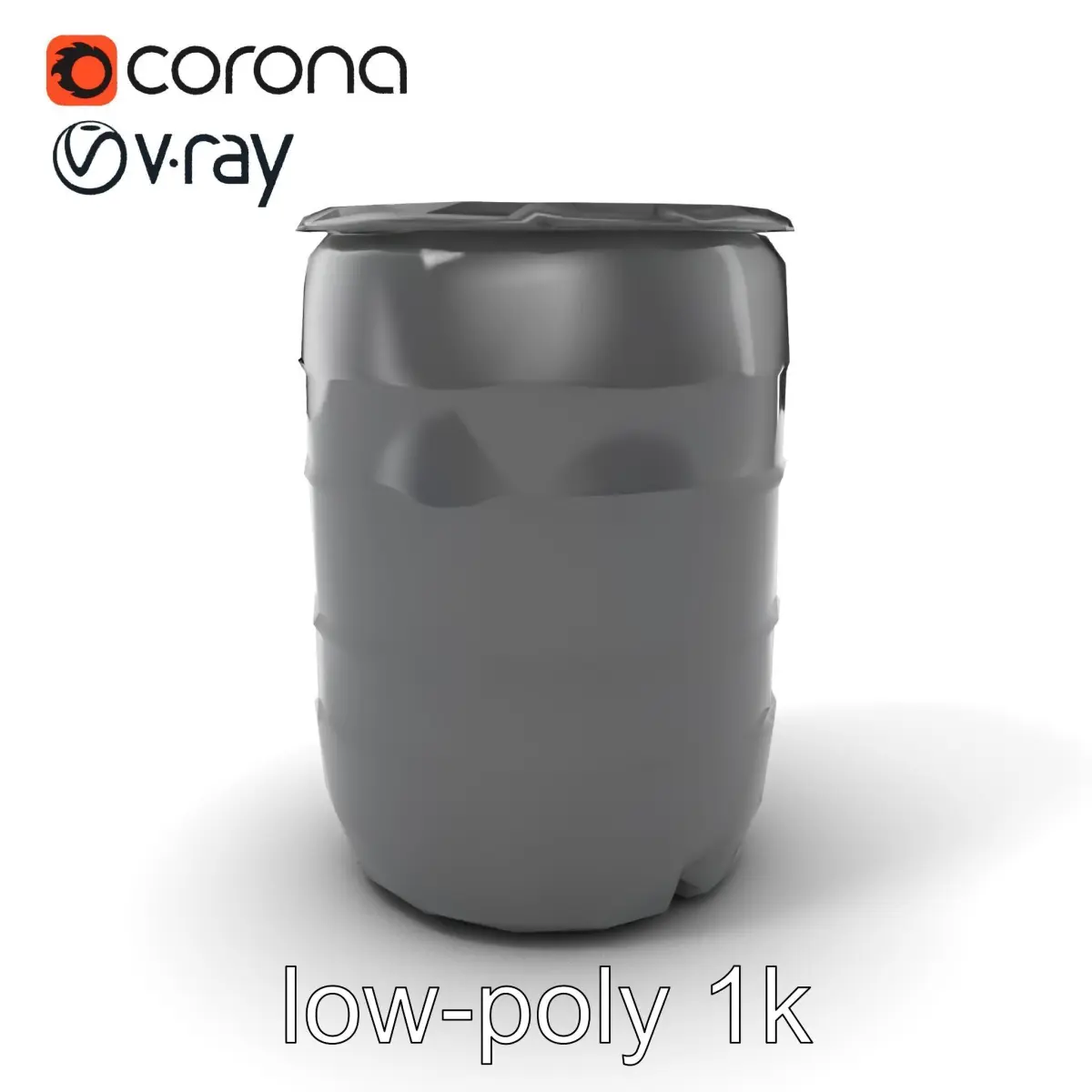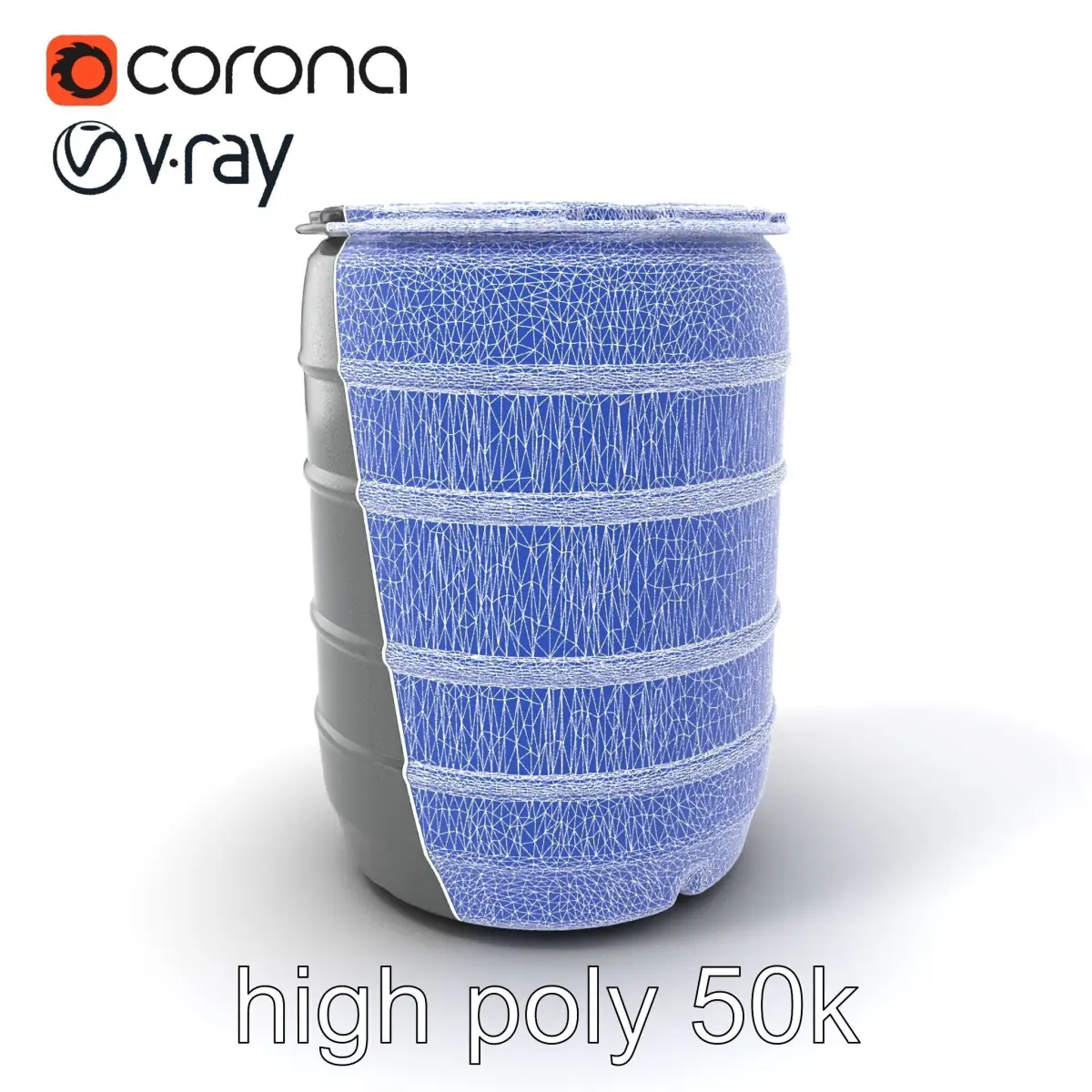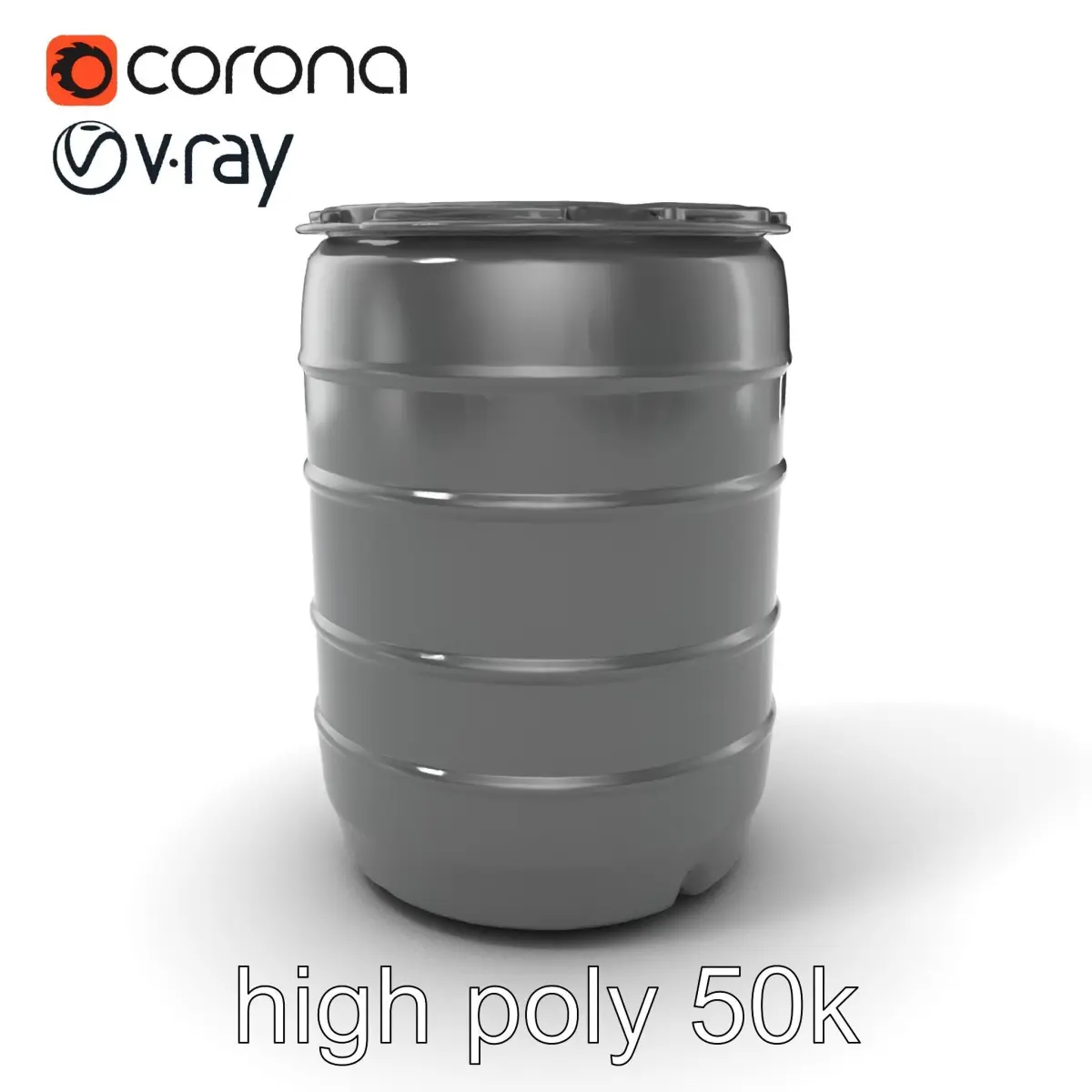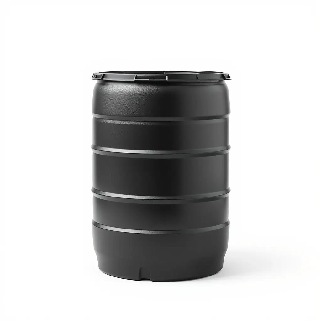 This 3D model of a plastic drum features a modular base with a 100-liter capacity, intuitive bind-lock system, and inset guarantee markings. Its carbon black finish and peeking-side reinforcement bands make it ideal for industrial design visualizations, product showcases, and simulations.