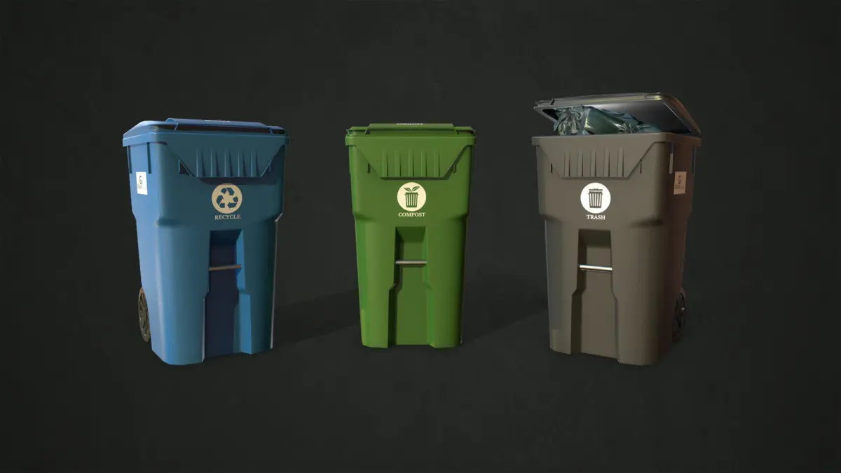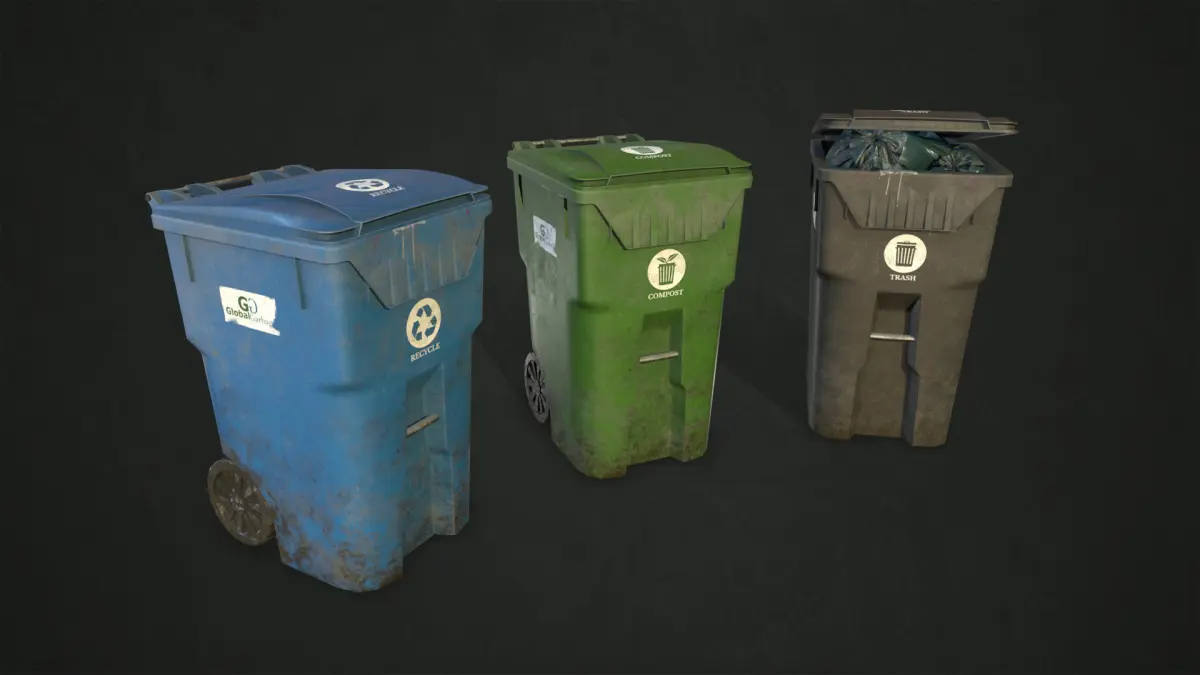 3D Low Poly game ready model of a Plastic Trash Bin with garbage bags. Model includes clean and dirty PBR textures with 3 different colors (green, blue and black), each one of the labeled (as compost, recycle and trash) and with a non-existing brand: