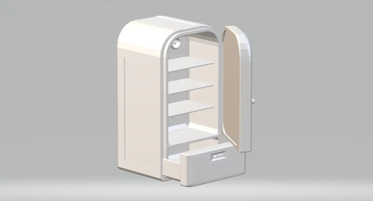 Fridge model generated in Plasticity with movable main and freezer door. Generated as part of a decor/furniture collection for general 3D assets. Can be 3D printed or loaded into VR environments. Prototype was fabricated on an Elegoo Mars system and model was uploaded to GravitySketch on an Oculus Quest for size proportions. Simultaneously published to Deviant Art and YouTube.