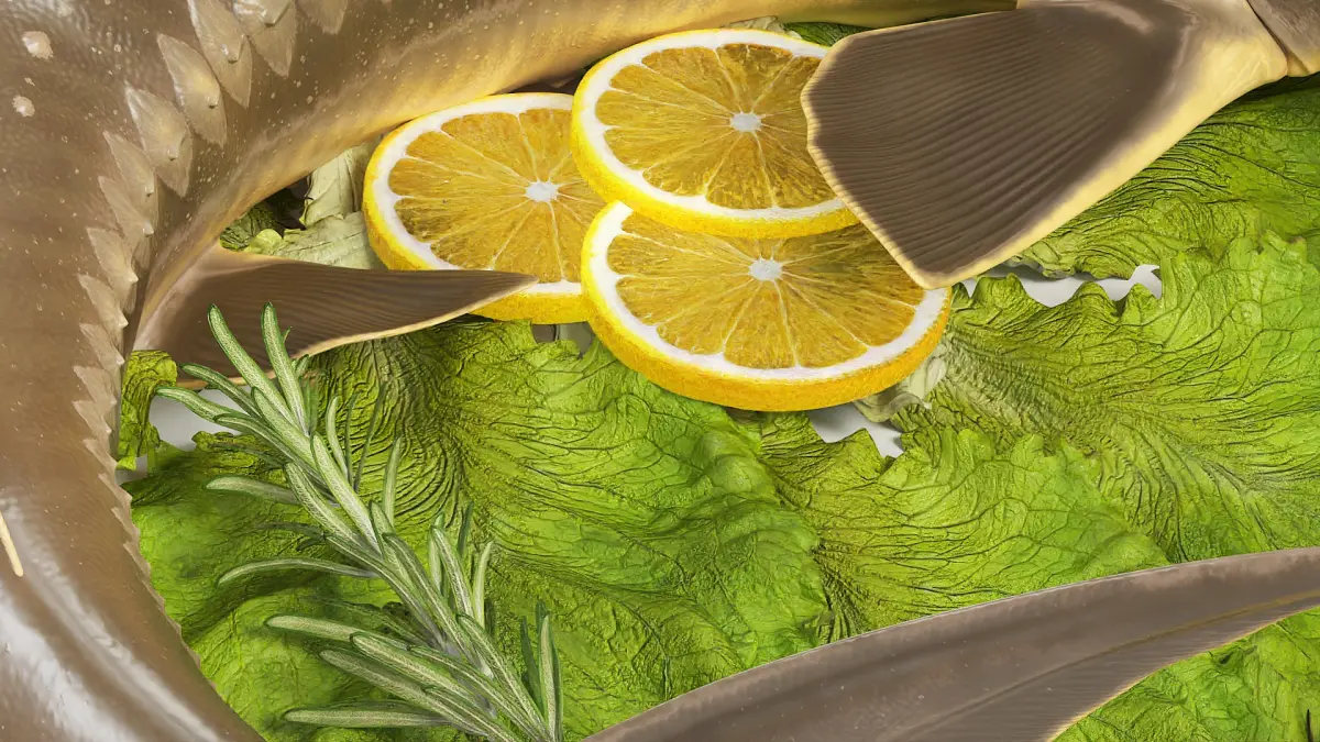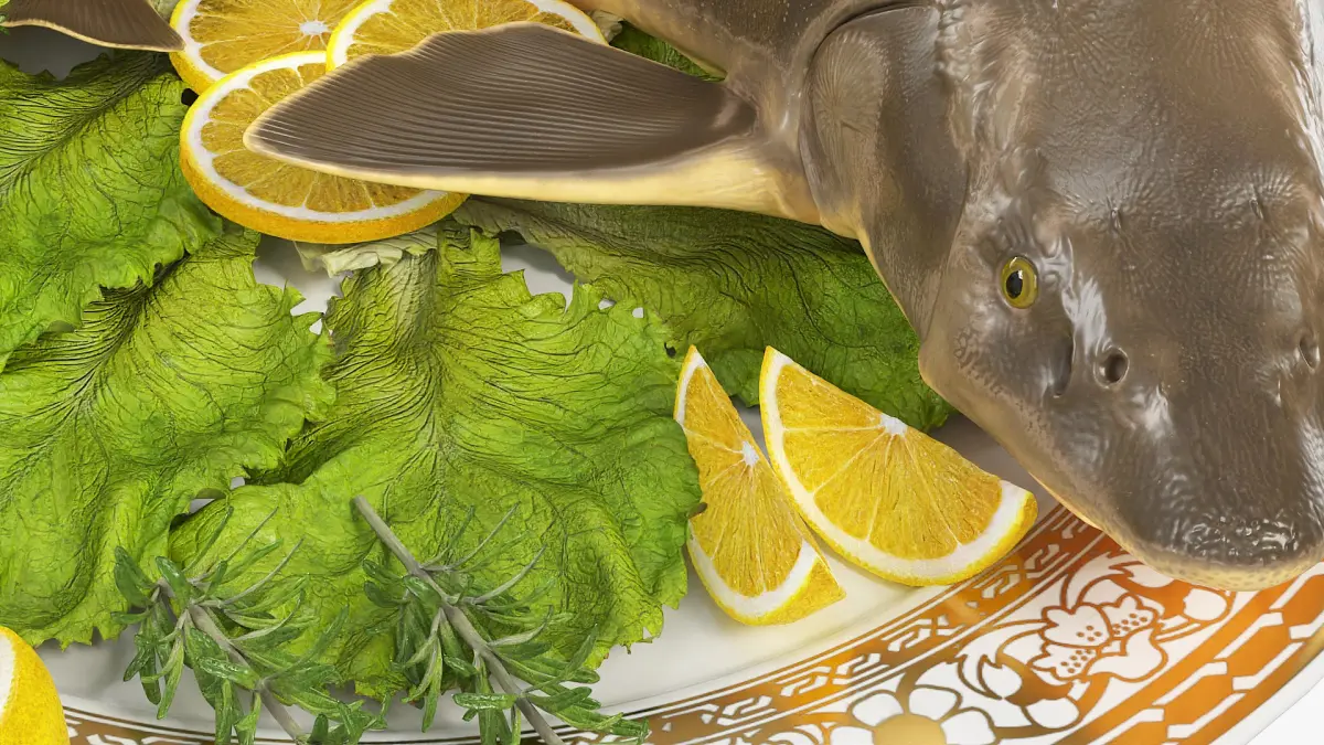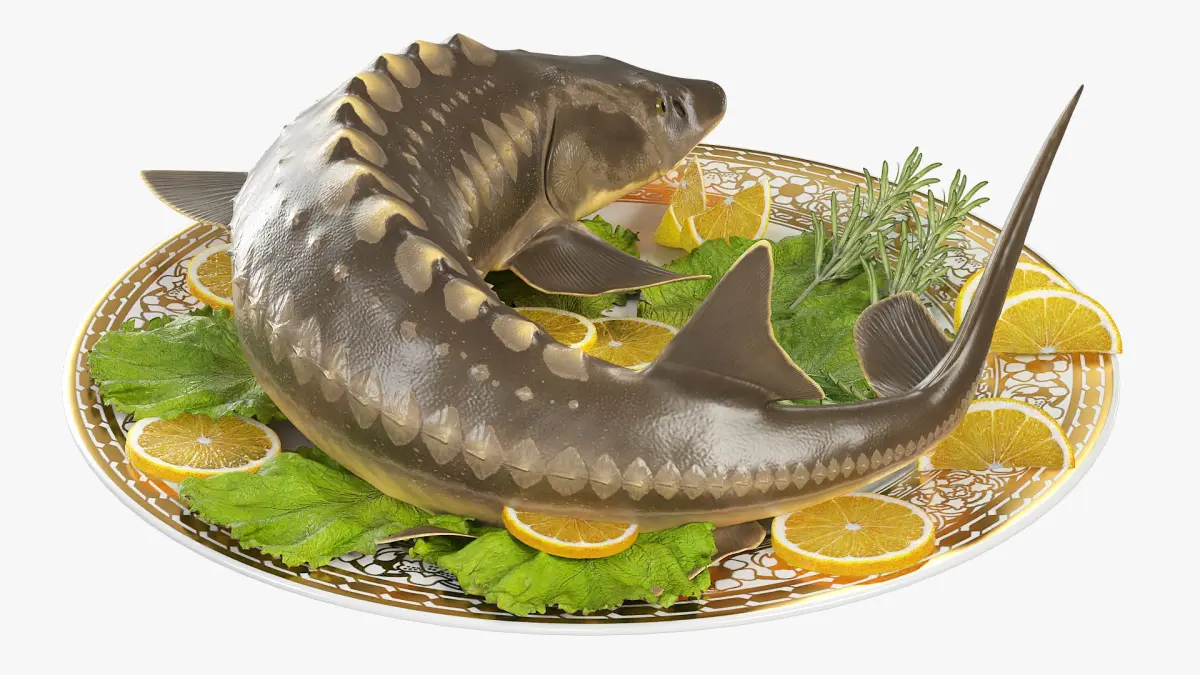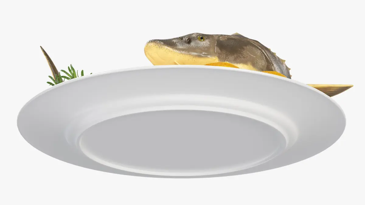 Plated Sturgeon with Herbs and Lemons is a three-dimensional model of ceramic plate with a garnish, and a white sturgeon (Acipenser transmontanus), that is a large freshwater fish species found in rivers, lakes, and coastal waters of North America.