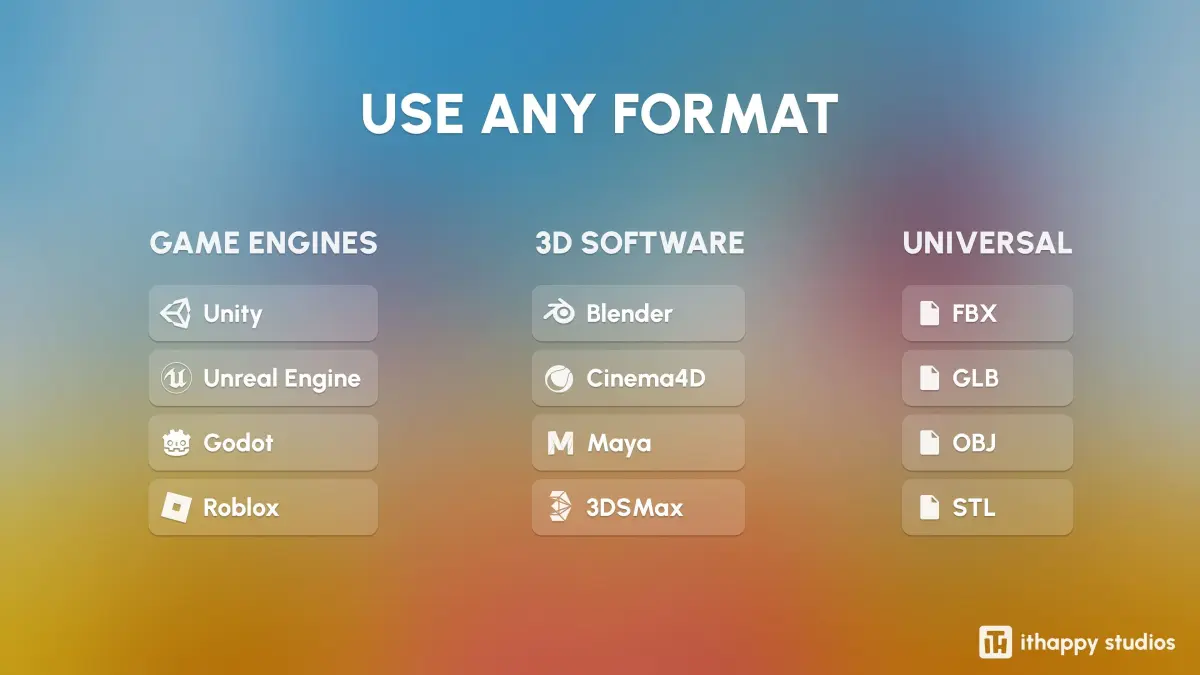 FILESYou’ll be able to download formats such as Unity Package, UE, Blender, C4D, Maya, 3DSMax, FBX, OBJ, GLTF, and STL.