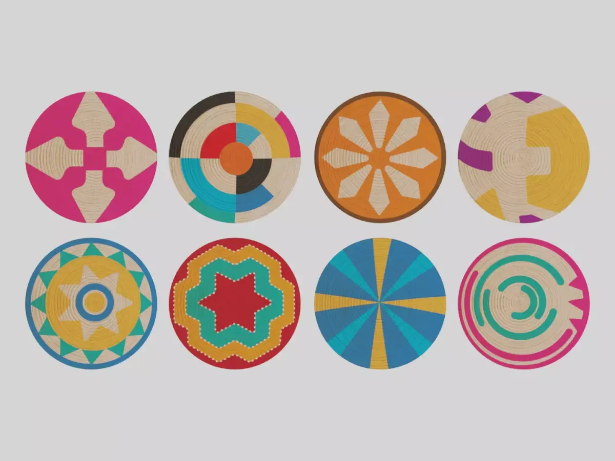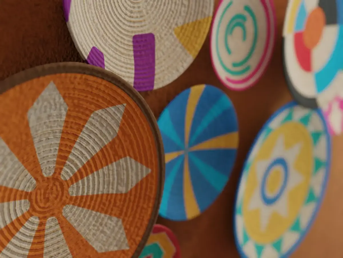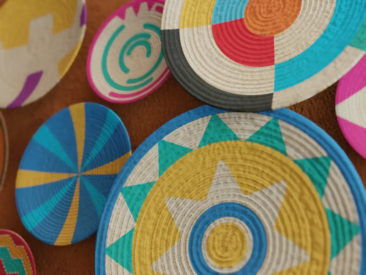Colección de platos decorativas tejidas con patrones geométricos y colores vibrantes, inspiradas en el arte textil tradicional mexicano. Estas piezas están diseñadas para usarse como decoración mural en visualizaciones de interiores con estilo bohemio, étnico o contemporáneo.