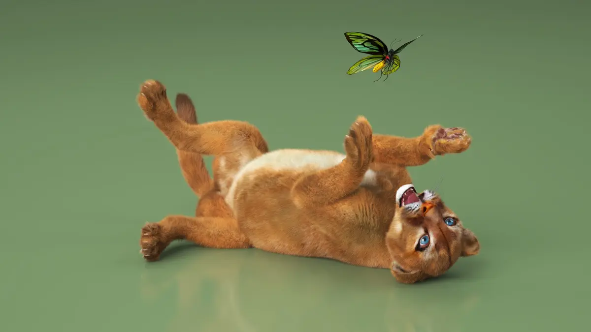 Playful Puma Cub with Butterfly Fur is a three-dimensional model of young puma (cub), that can be referred to as a cougar or mountain lion and that can be primarily found in the mountains of North and South America.