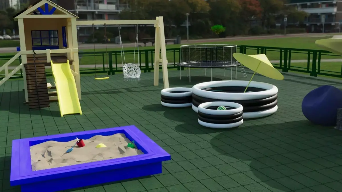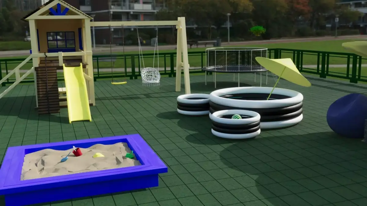 Children's playgroundHere you will find a children's trampoline made of metal and fabric, a children's slide made of wood and plastic, a children's pool with a ball and an inflatable ring, a sandpit with toys, and a relaxation area for parents. The children's playground has been designed with the needs of parents and children in mind, and all materials are Corona 11 standard. All areas shown in the photo are sold together, as well as the tiles on the playground and the fence.