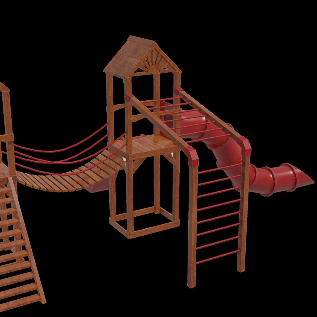 2x Tube slide1x Regular slideStairsRamp with ropeHandlesHouse - big versionHouse - small versionBridge2x LaddersSpinnerSwingRopes to climbClimbing WallField under swing