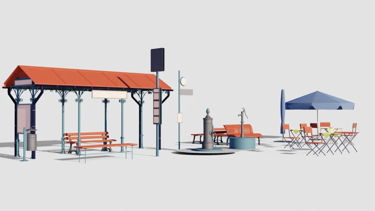 - 14 base mesh models for city/street/plaza exterior scenes.