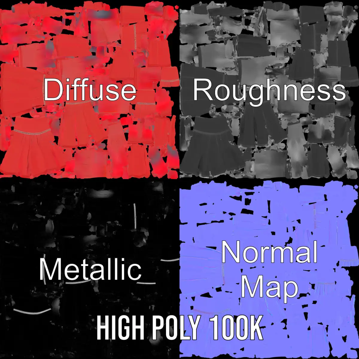 This pleated skirt 3D model pack features three levels of detail: low-poly (1000 triangles for mobile), middle-poly (10,000 triangles for environment), and high-poly (100,000 triangles). Ideal for use in fashion simulations, character design, and virtual environments. The model is compatible with major 3D software like 3ds Max, Maya, Cinema4D, Blender, and game engines such as Unity and Unreal.