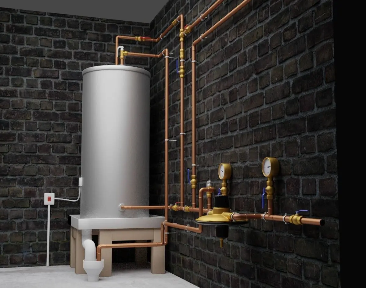 Realistic model of a domestic hot water cylinder plumbing and drainage system installation. I've based this on actual real-life design. It comes complete with a hot water cylinder, power isolator, pressure reducing valve, pressure gauges, isolating valves, non-return valves, tempering valve, hot water and cold water expansion valves, and copper pipework. The native file is from Blender 2.82, rendered in cycles. Export files are available in fbx and obj formats.