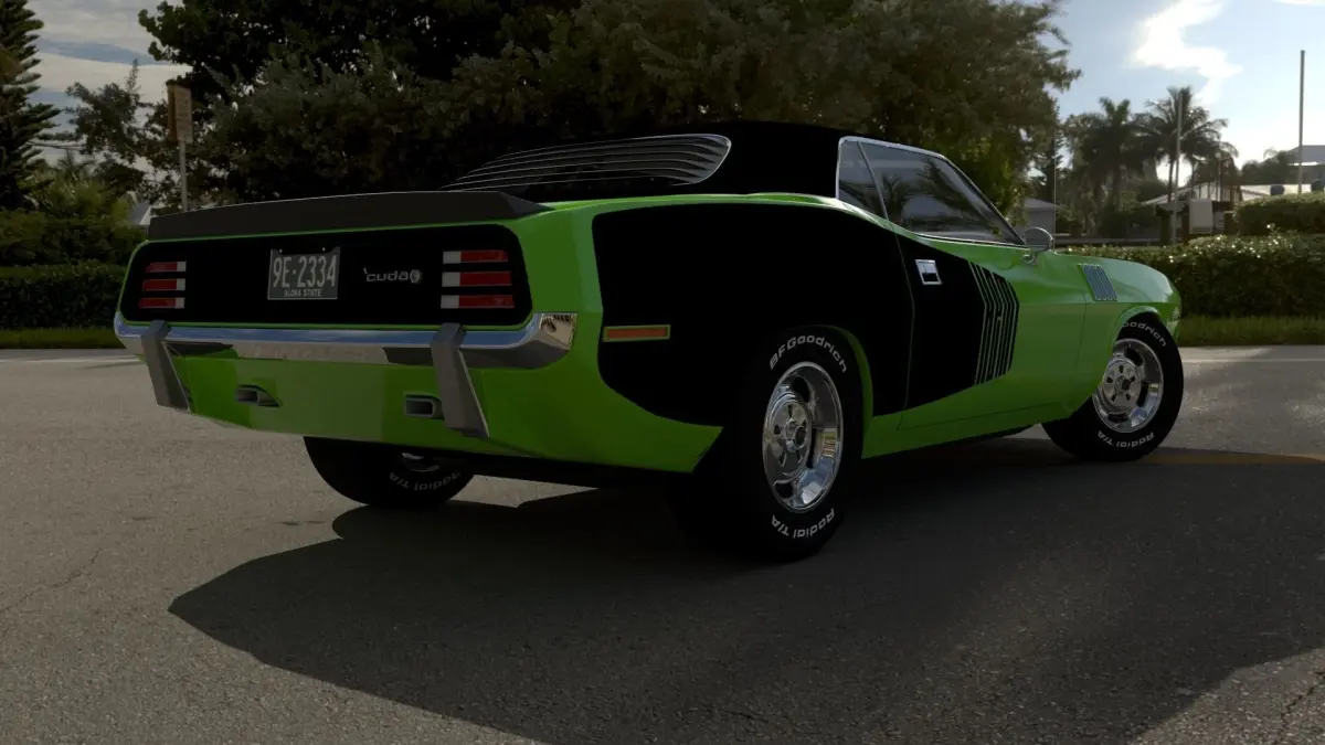 The Plymouth Barracuda model from 1970 and 1971. It includes two versions of the car that differ in the front mask and mudguards, several tuning elements and the interior. 4x Body, interior, and tyre textures are PBR, the rest are simple materials like chrome, car color, metal and some like glass lights are with textures that are included.The PBR body textures have an alpha version, so you can change the base color of the car.