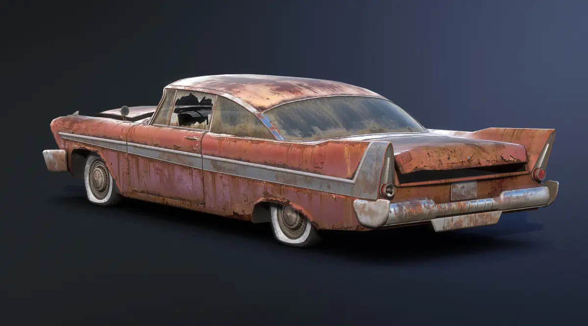 Game low-poly 3d-model of rusty abandoned muscle car Plymouth Fury 1958.