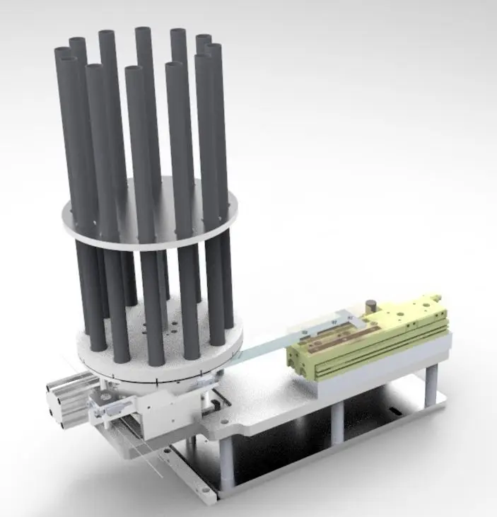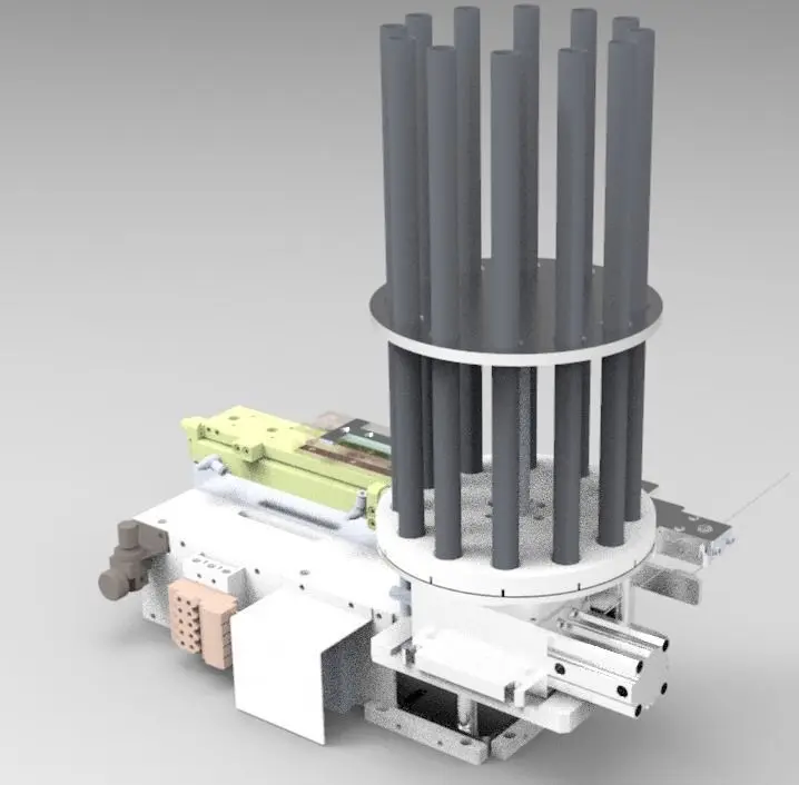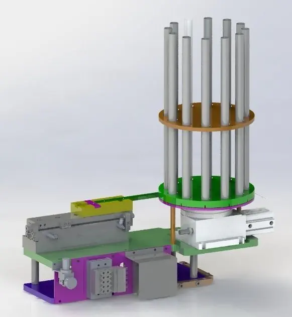 Pneumatic division rotary feeding mechanism (bearing), the mechanism through the pneumatic divider feeding, through the footwall of the clearance position, in the process of rotation, through the bearing to stack weight class materials and turn the bottom materials stripped away, into the cavity, to achieve the function of automatic loading, it can be made into a cylindrical materials plate can be multiple feeding, classic structure, the design process to use for referenceMechanism include