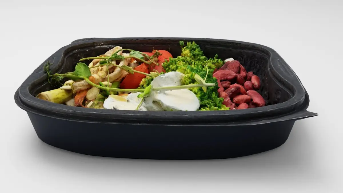 Poke bowl lunch box with tomatoes broccoli arugula quail eggs asparagus and beans