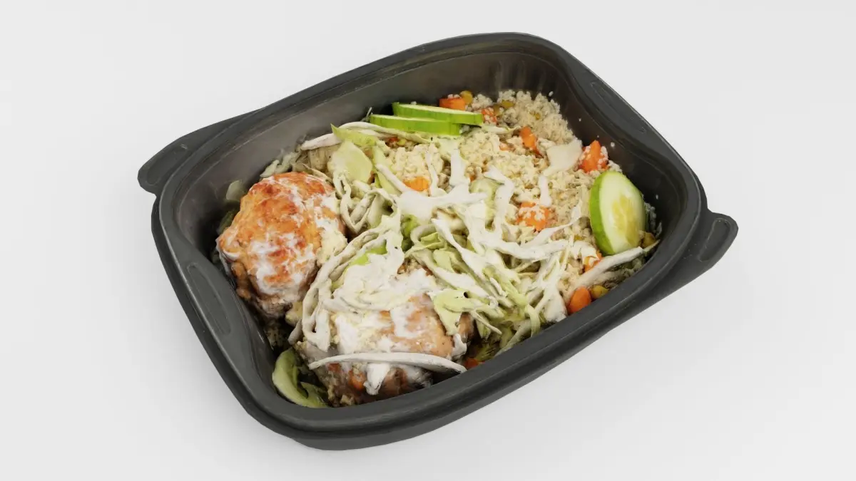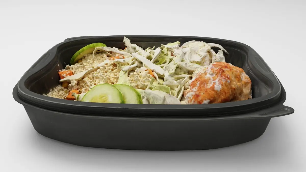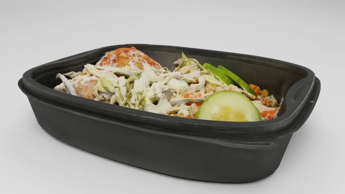 Poke bowl lunch box with pilaf, cucumber, meat ball and salad