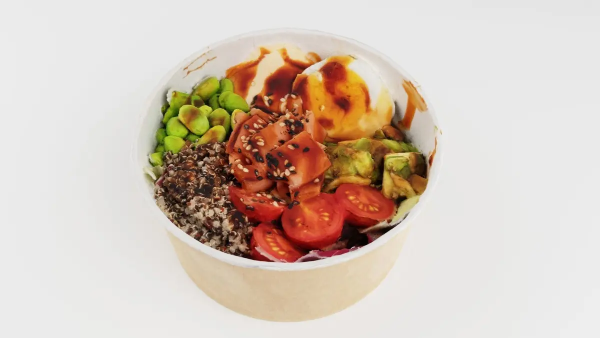 poke bowl lunch with tuna rice avocado mango seaweed chuka salad