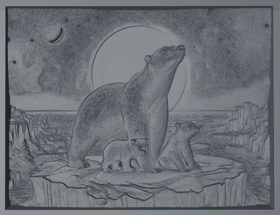 3d model of lithophane in STL format+ project UltiMaker Cura - which can be printed on a 3D printer Size 130mm x 100mm x 4.8mm, scalable.Polar bear with cubs is a very beautiful lithophane against the background of the sun and ice floes.Maximum image thickness 3.6 mm minimum 0.8 mm. Printed with a 0.4 mm nozzle, white PLA plastic