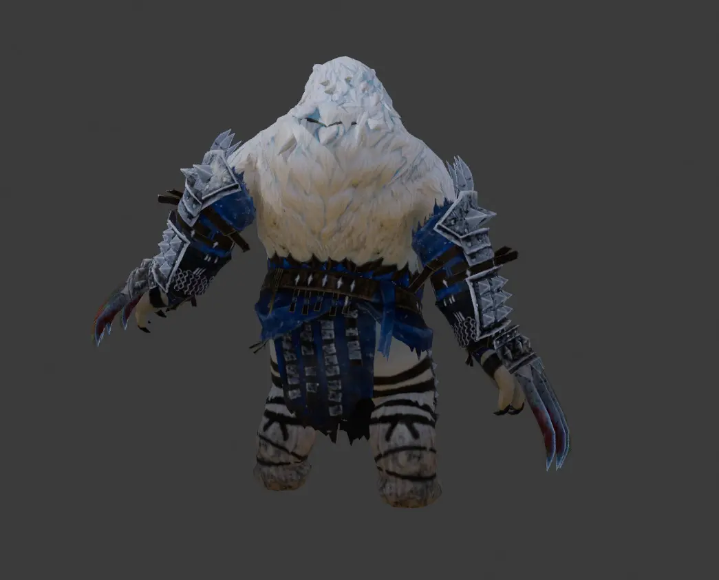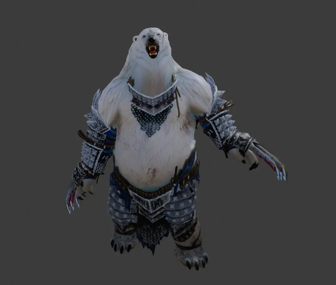 Lowpoly model of Polar beast,game ready,rigged. PBR textures. Include weapons and nude mesh. The Polar Beast is a majestic and formidable creature adapted to the icy landscapes of the polar regions. Cloaked in a thick layer of frost-white fur, this beast navigates the frozen expanses with ease. Its sturdy limbs and powerful physique enable it to traverse the snow-covered terrain effortlessly. The visualization of this character was done in Blender, Substance Painter. The rendering result in other versions with different settings may vary.