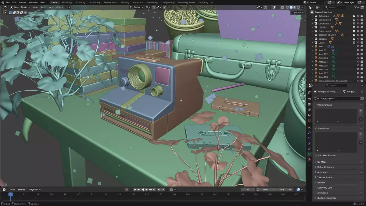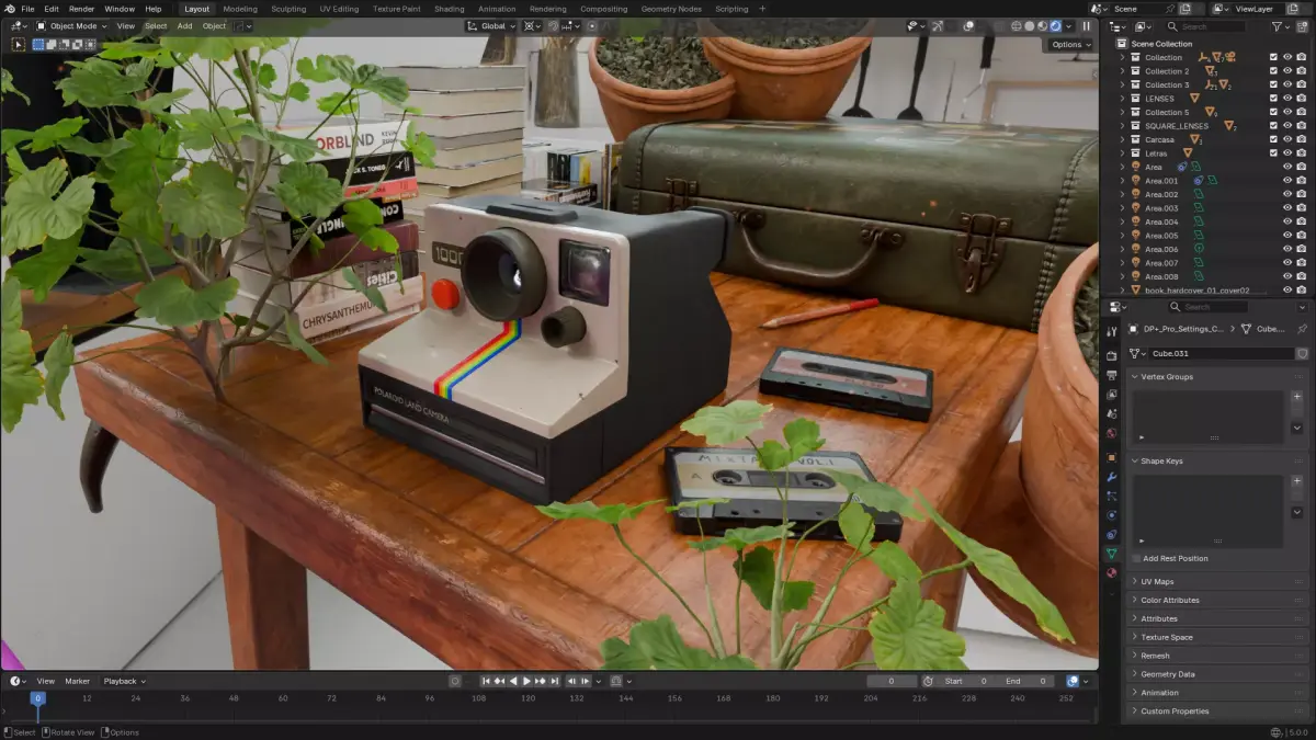 (you will get both Blender file versions, the common/normal Polaroid camera, and also the one that is transparent, also the full artwork scene with the wooden table and all those elements) (the wooden table and the rest of the elements of that scene are from polyhaven, I modelled the Polaroid Camera by hand)