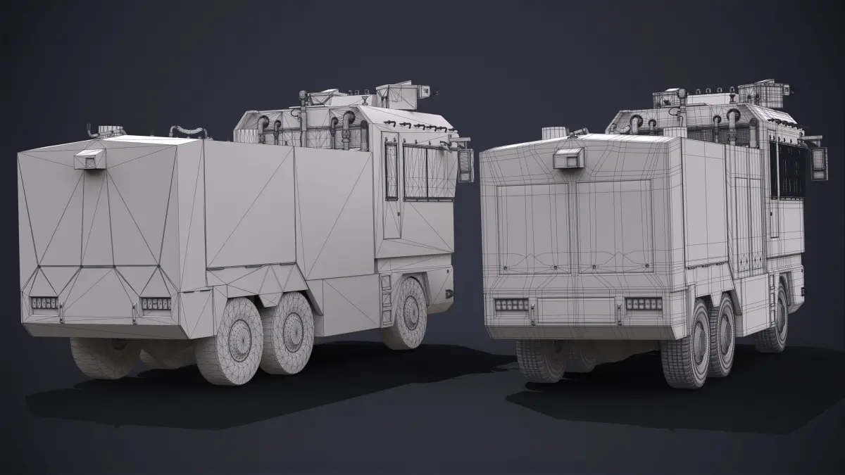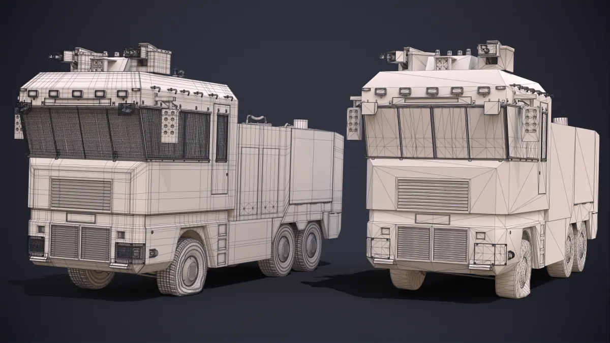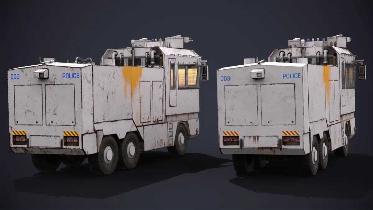 Highly detailed 3D model of the Police Car Water Cannon. The model has high-poly and low-poly variants. Ideal for various street protest scenes.