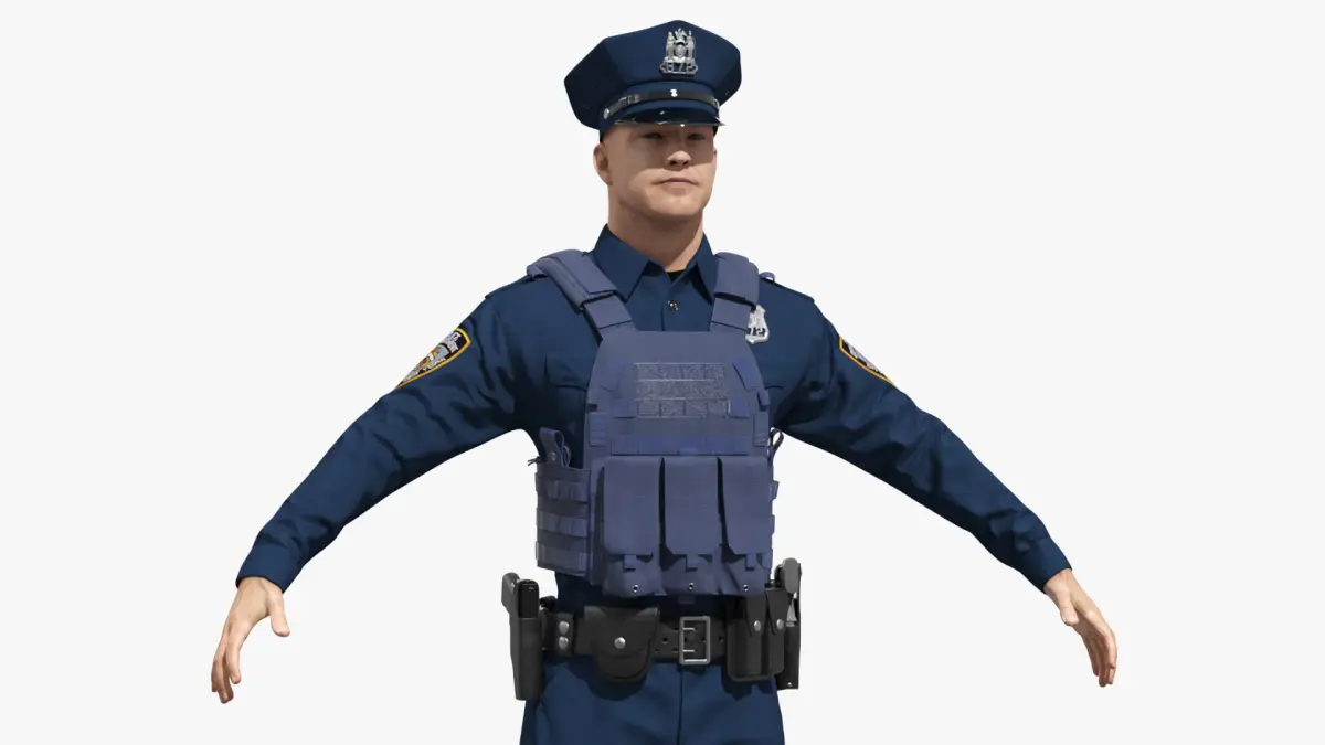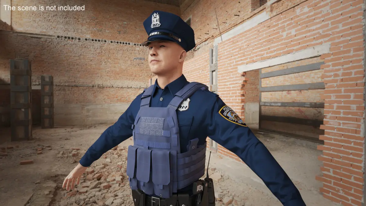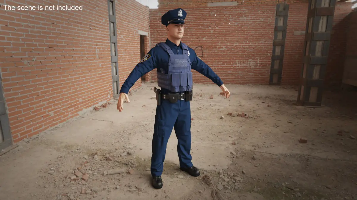 Police Officer in Tactical Vest Navy Blue is a three-dimensional model of a police officer in uniform, designed to accurately represent law enforcement apparel and gear.