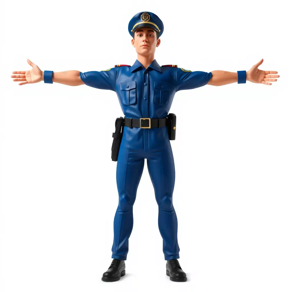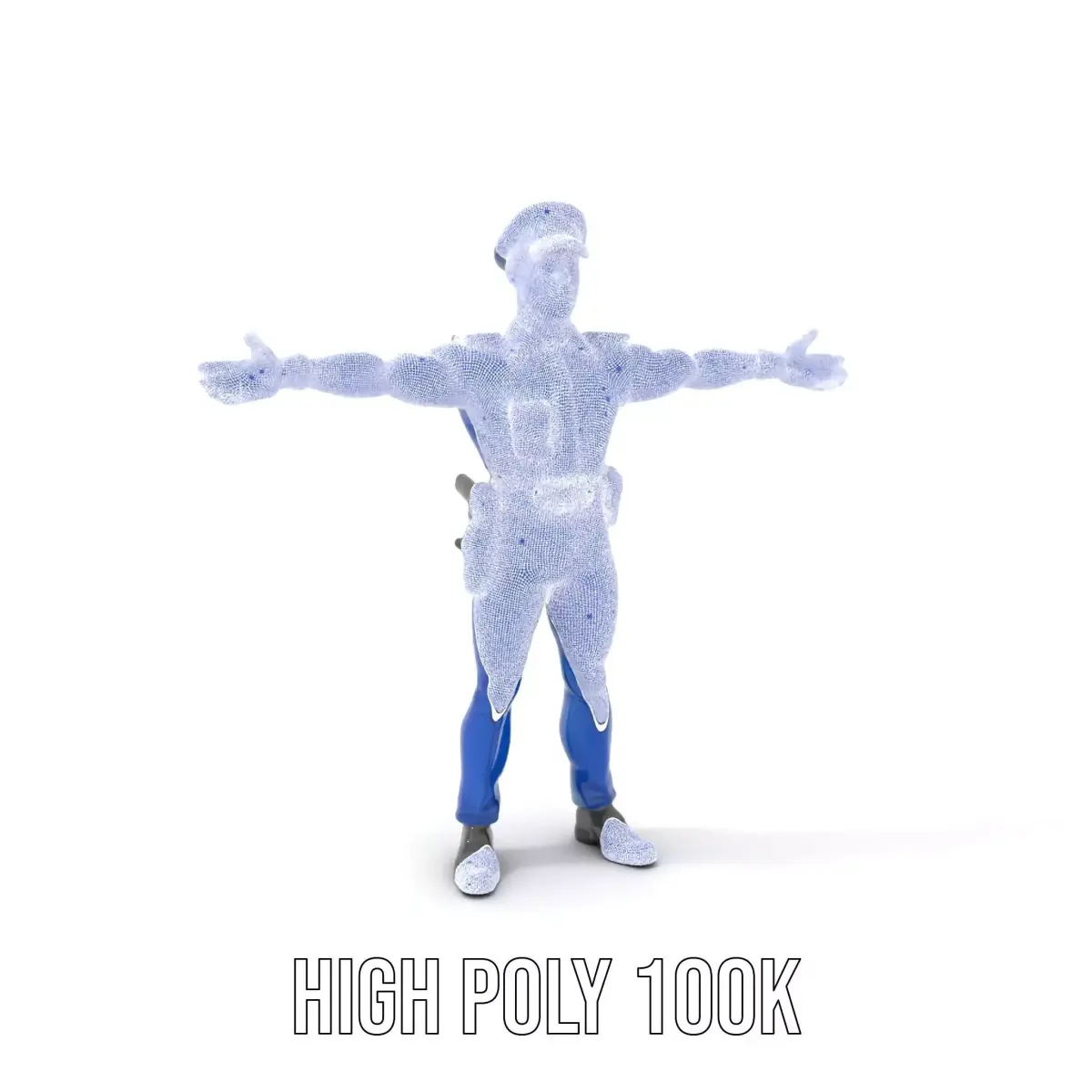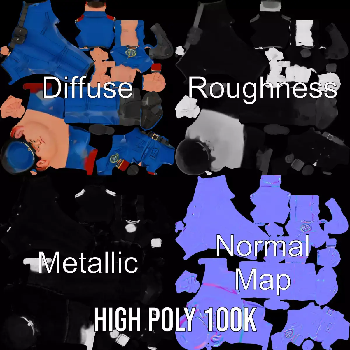 This 3D model pack features a highly detailed police officer in a classic blue uniform, complete with accessories like badges and a belt. Each model has 3 levels of detail: low-poly (1000 triangles for mobile), middle-poly (10,000 triangles for environment), and high-poly (100,000 triangles), which allows for the use of this model in production rendering (such as 3ds max, Maya, Cinema4D, Blender, Vray/Corona/Cycles and all others), game engines (Unity and Unreal compatible), and interactive presentations, providing a choice of detail based on the LOD System principle. Ideal for use in video games, animations, simulations, and virtual reality experiences. The model's textures are PBR, Diffuse, NormalMap, and reflection/roughness/metallic, which are suitable for any modern rendering engine. All models are accurately unwrapped and have no overlapping UVs. All textures are 4096x4096 in size. The first image is the reference used for creating the 3D model. It is important to carefully evaluate the quality of the model by examining the preview images that display the topology and polygonal mesh. These previews (WIRE and WEB 3D Preview) clearly demonstrate how accurately the model matches the original reference and how well the geometry has been executed. Please like and leave a comment if you enjoyed this model.