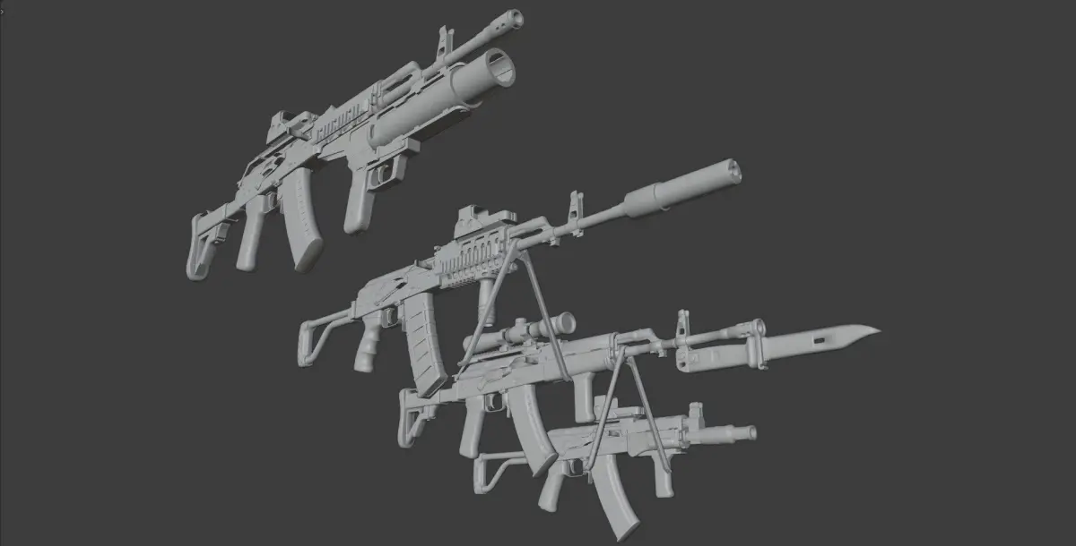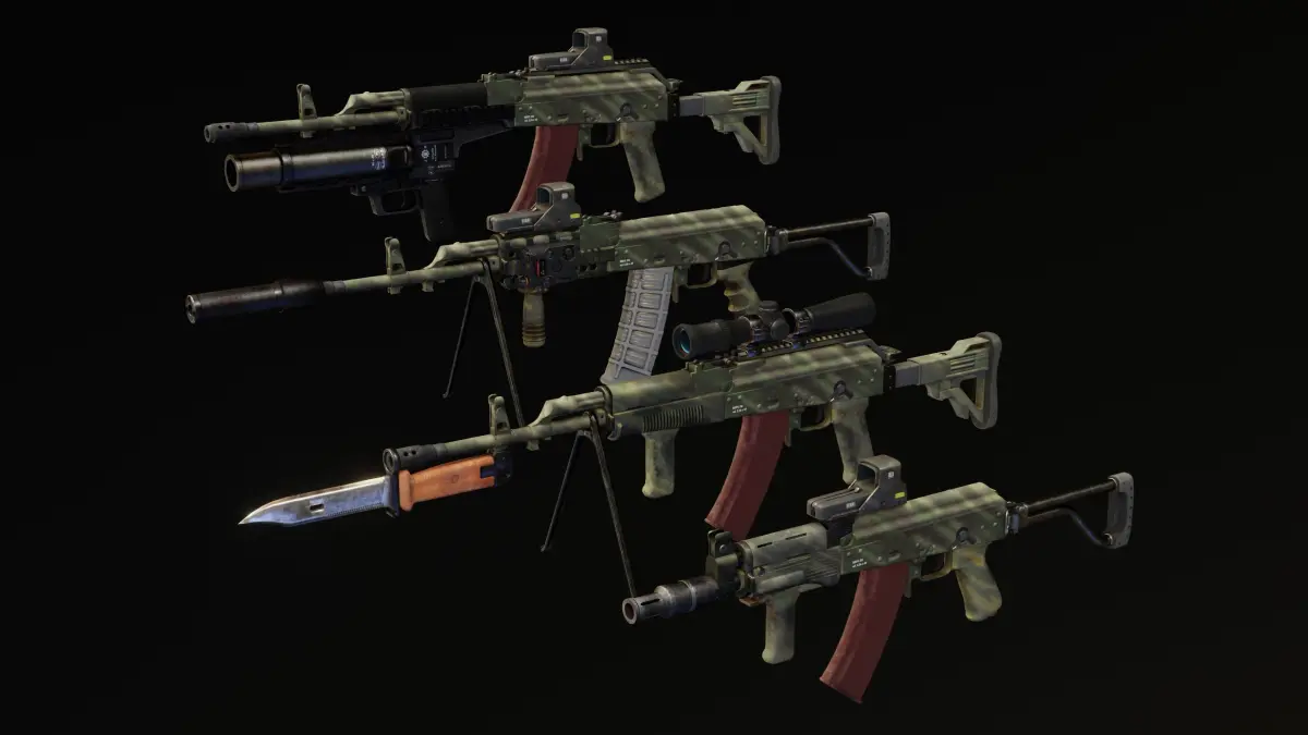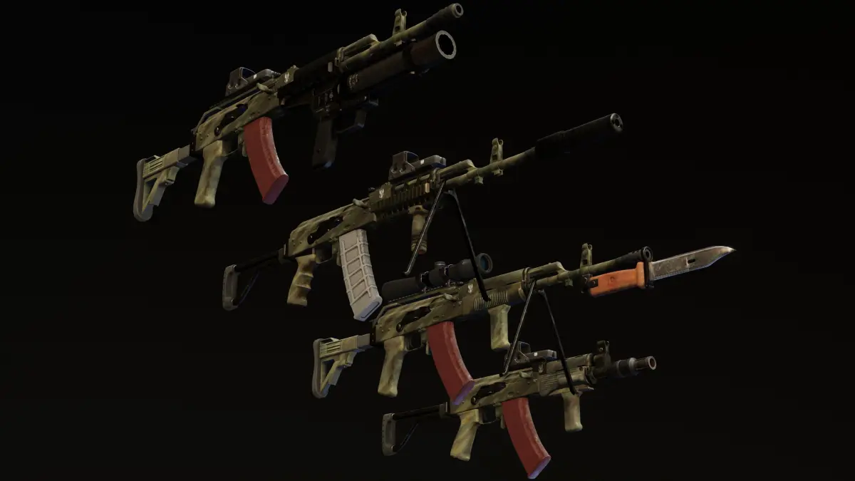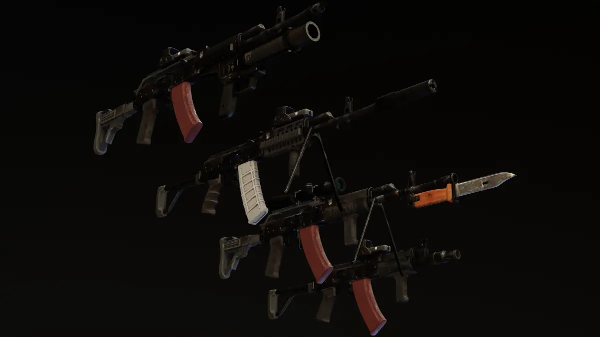 Big pack of classic Polish AK made by Łucznik Arms Factory in Radom.There are 2 color variants: black and camo, and also clean/new version Models are separated to 4 versions, all rigged
