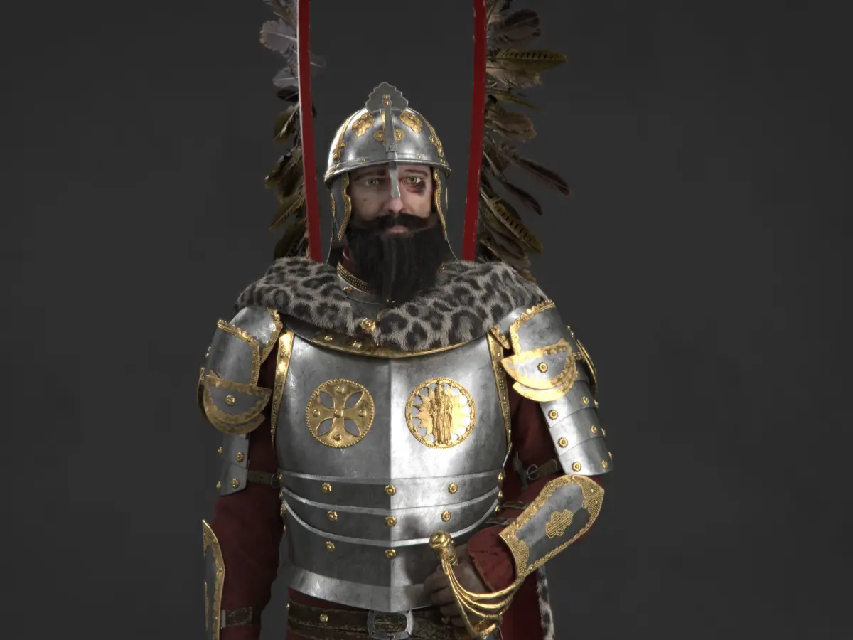 His name is Darek Mazur and he is a polish hussar knight. The character is modelled in quads and is subdivided with a Turbosmooth modifier. Different texturing/shading workflows where used on this character. Some objects are UV-unwrapped, others rely on tileable maps and the use of Vray Curvature Map for masking. For example most of his armor (metal parts) and leather straps. The Face and his clothing are properly UV-unwrapped and have a sculpted displacement map and a painted texture. The smaller parts have a resolution of 2048x2048 and the bigger geometry a resolution of 4096x4096.