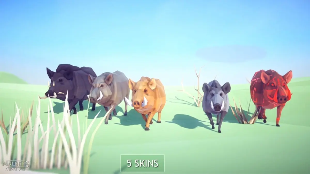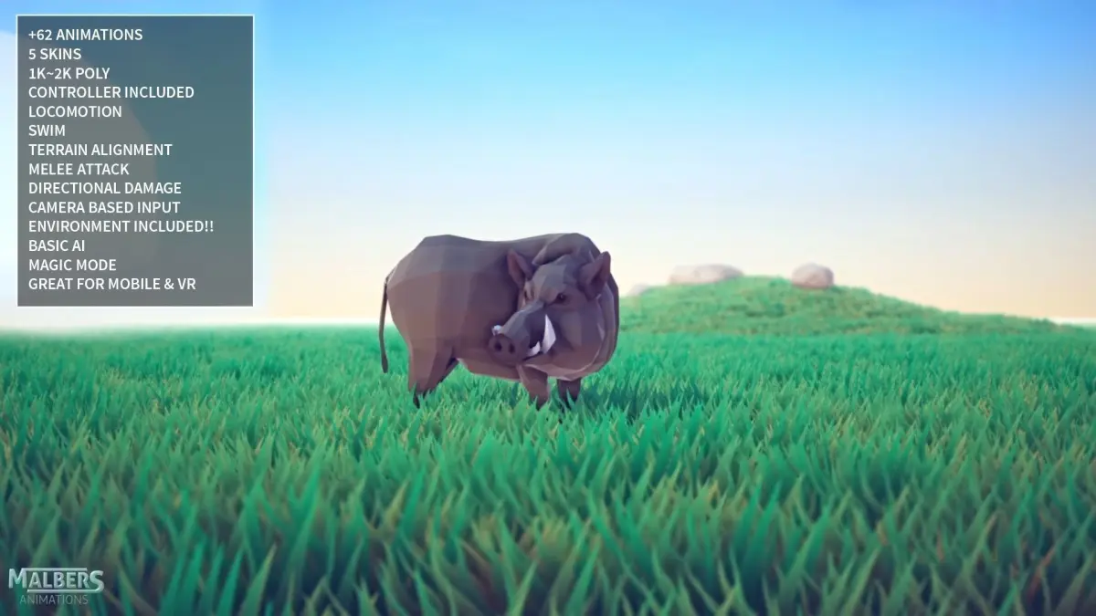 They're so many amazing Low Poly Art Environments but is so sad that there's no wild life to populate them.. So here is some beautiful animals! (Boar)They come with +62 AAA Animations. Includes character controller, and a animator component but you can always create your own or modify the existing one. This controller includes these Logic's:-Locomotion-Terrain-Fall-Jump-Attack-Actions-Environment Included!!!!4 different Styles(Common,Albine, Elk, Fawn)Textures Easy to modify (128x64)