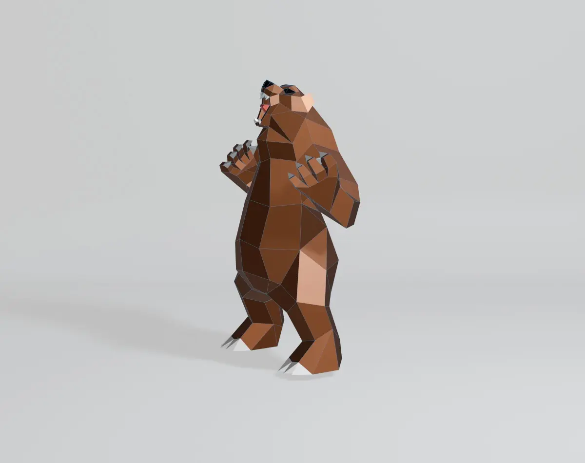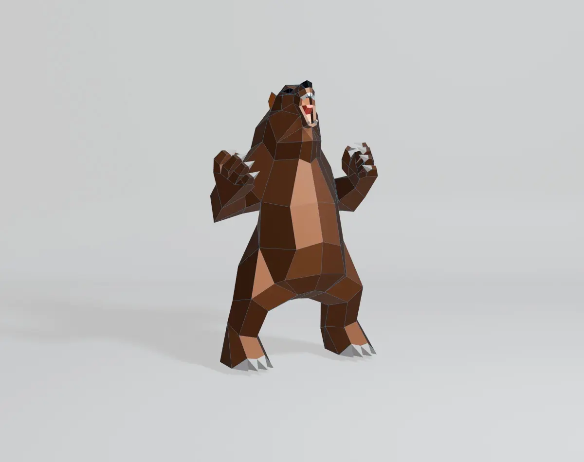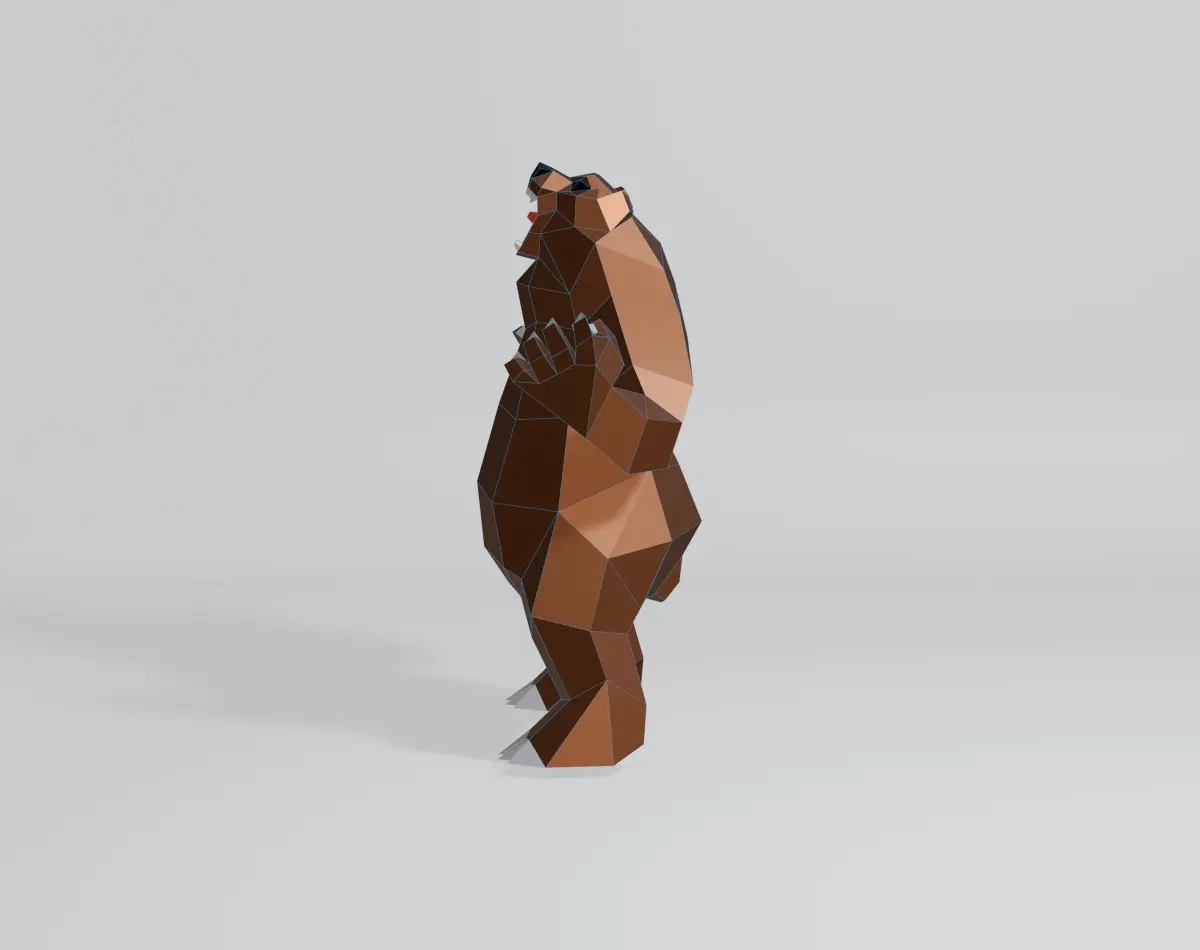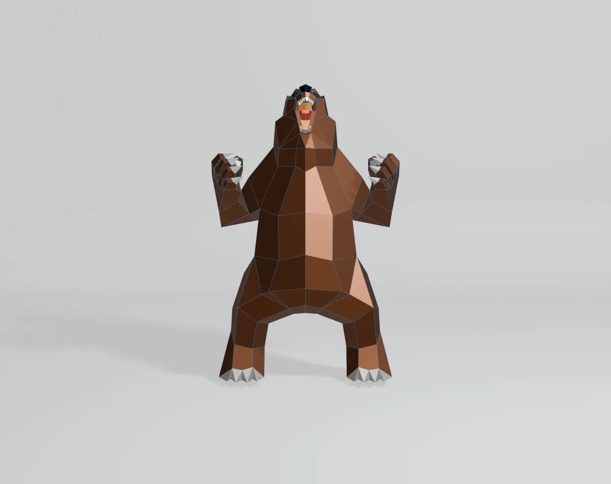 Welcome to my 3D world! I specialize in creating simple yet captivating geometric shapes. My latest creation is a stunning angry bear model, designed with intricate polygonal and low-poly elements. Crafted in Blender 3D and rendered using EEVEE, this model features a base color material with no texture. It consists of 442 vertices, 928 edges, 488 faces, and 880 triangles, all with fully co-planar faces. The OBJ and Blend files are in the N-gon version, making it perfect for projects like 3D printing, papercraft, sheet metal sculptures, and CG applications. Thank you for checking out my model, and have a wonderful day!