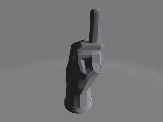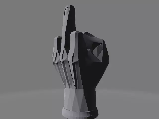 A stylized 3D-printed hand sculpture with a minimalist polygonal design, featuring the middle finger extended in a bold, geometric form. The smooth, seamless surface and sharp angular lines give it a clean, modern aesthetic. Ideal as a provocative desk piece or art display.