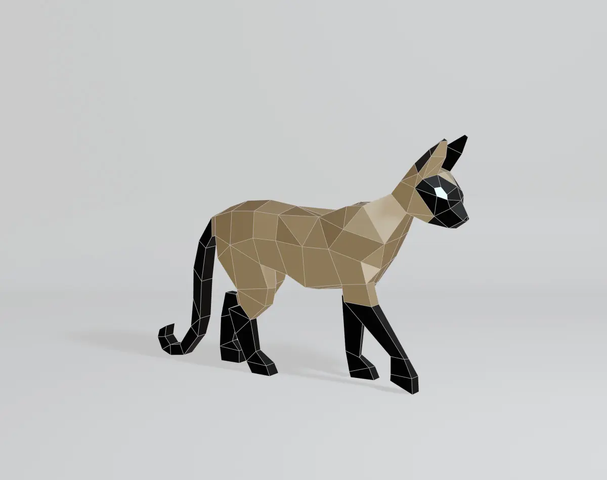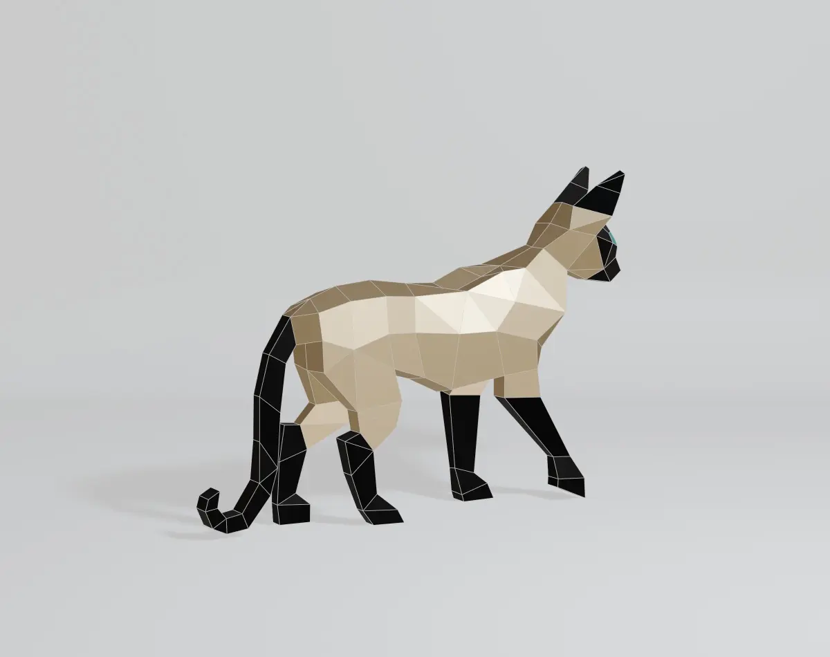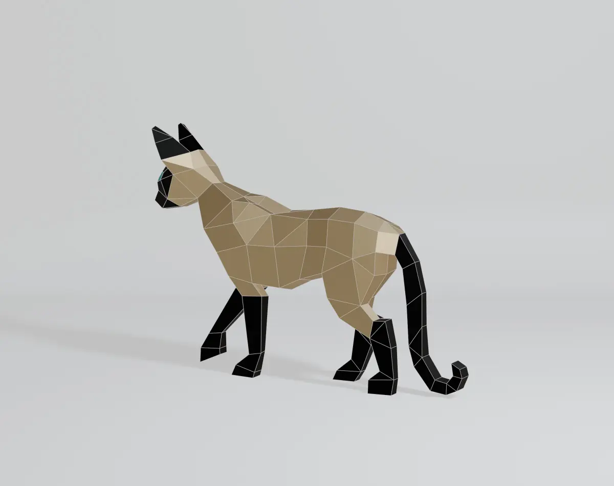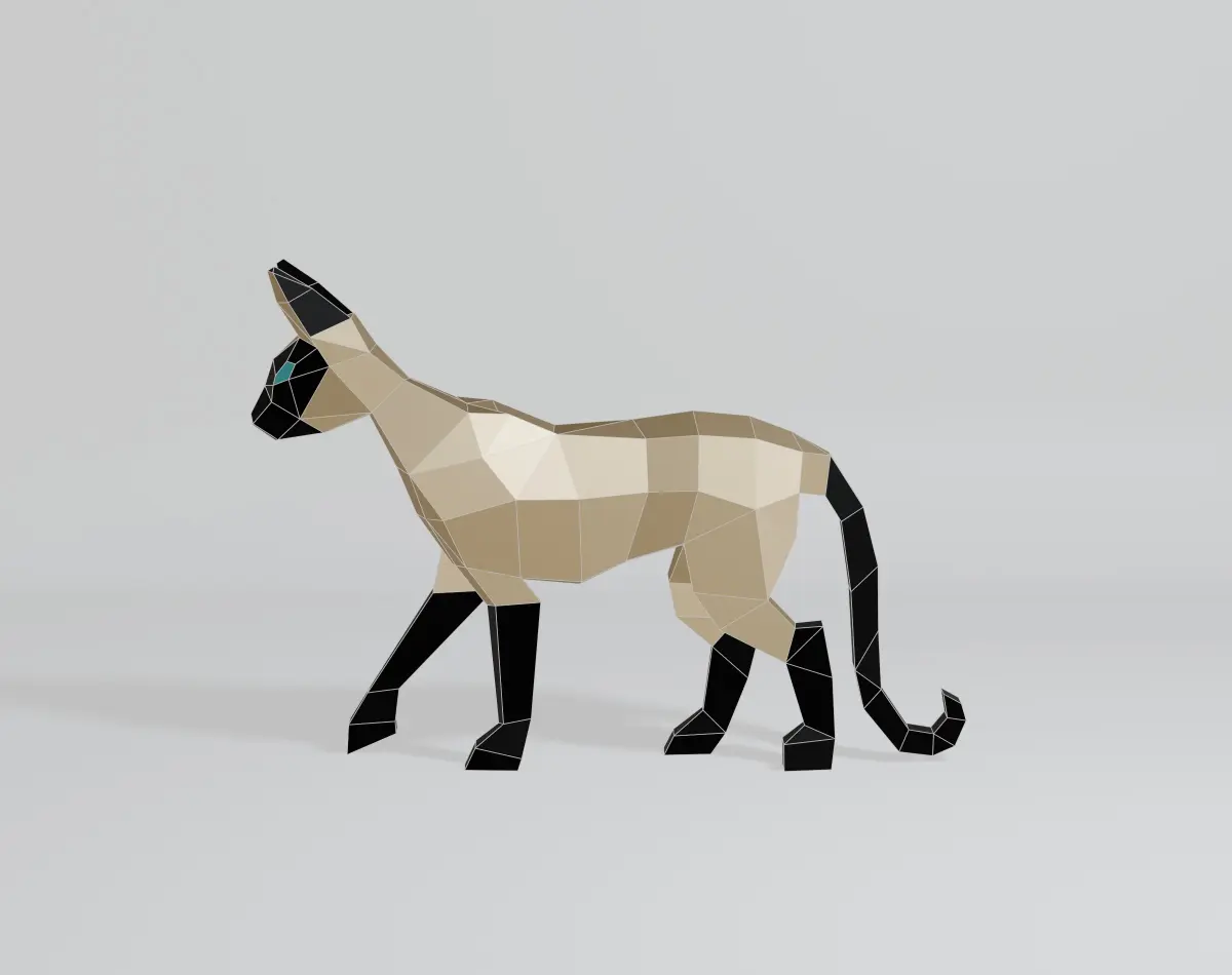 Welcome to my 3D world! I specialize in creating simple yet captivating geometric shapes. My latest creation is a polygonal Siamese cat model, designed with intricate polygonal and low-poly elements. Crafted in Blender 3D and rendered using EEVEE, this model features a base color material with no texture. It consists of 243 vertices, 527 edges, 286 faces, and 482 triangles, all with fully co-planar faces. The OBJ and Blend files are in the N-gon version, making it perfect for projects like 3D printing, papercraft, sheet metal sculptures, and CG applications. Thank you for checking out my model, and have a wonderful day!