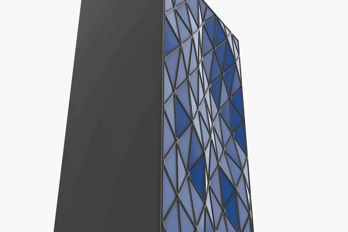 Polygonal Crinkled Building Facade, with a science fictional effect to add a unique taste to the elevation of the building, the glass panels are surrounded by smooth skeletal frame to reduce the aggressiveness of the sharp edged polygons on the facade.