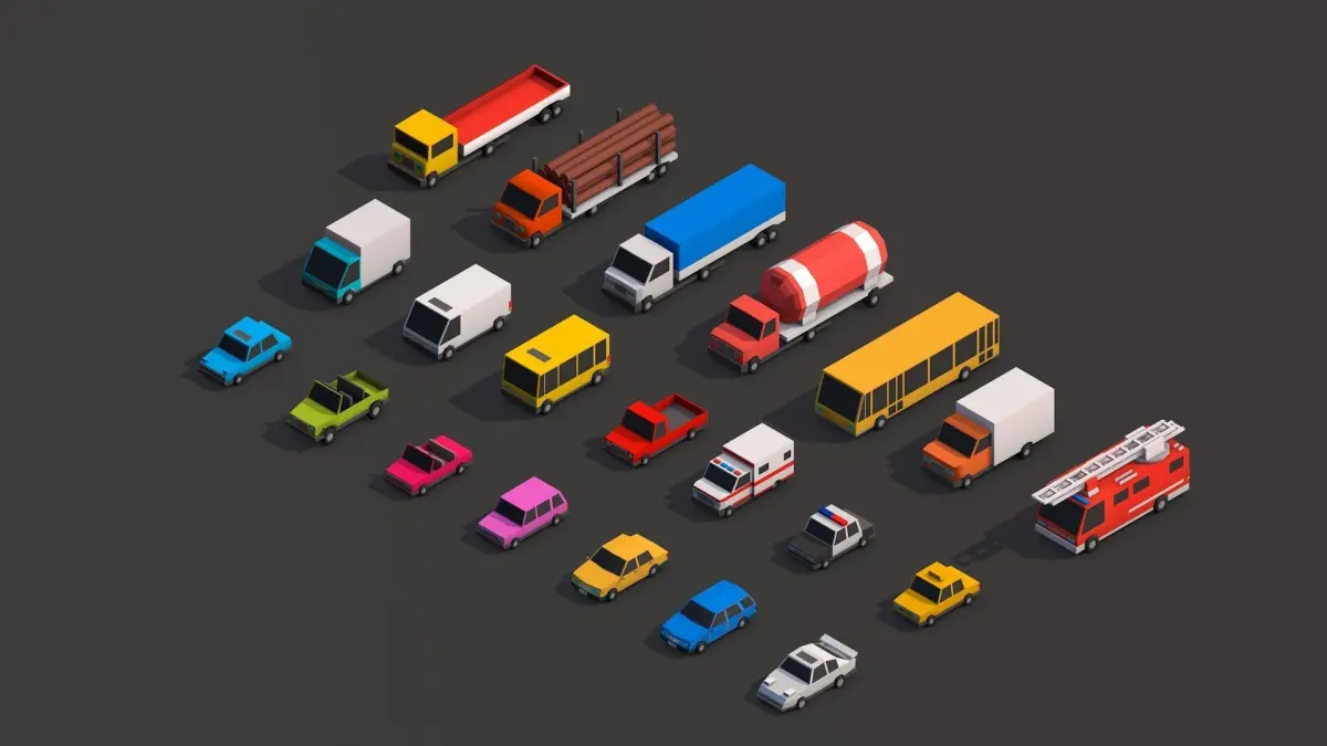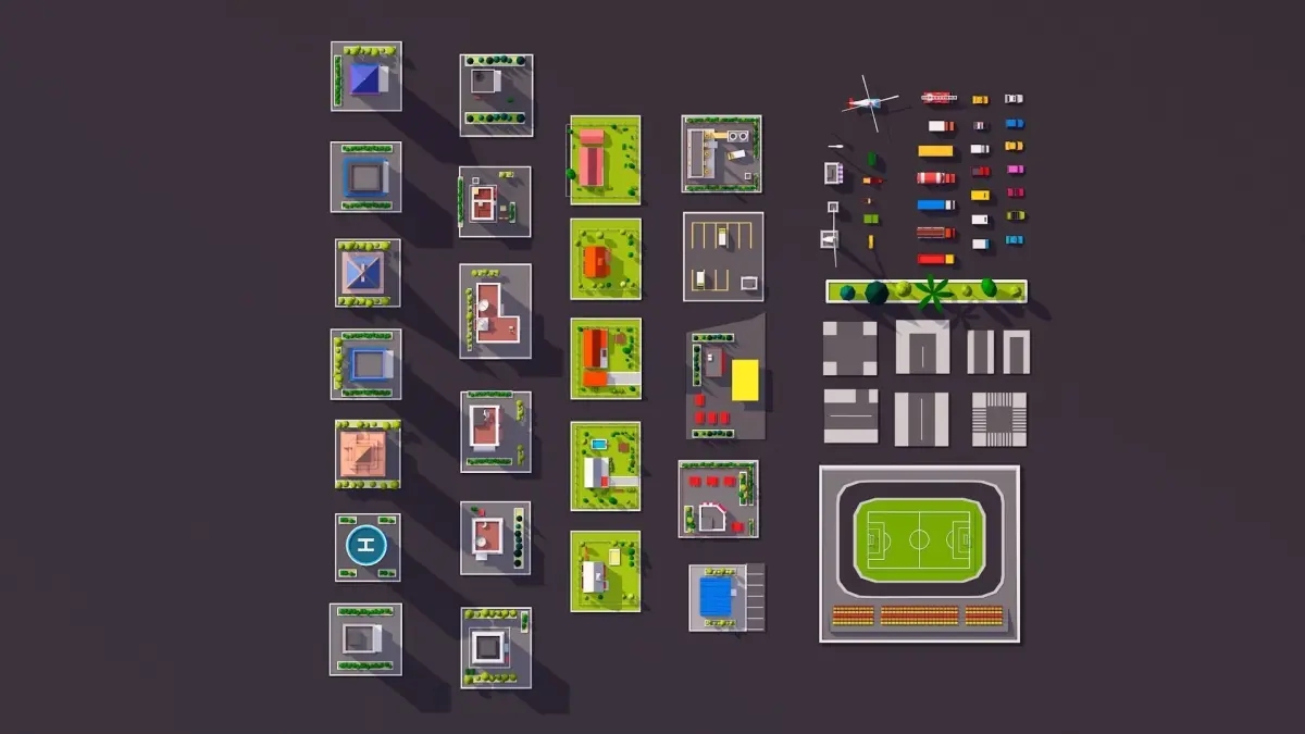 - Cartoon Low Poly City Buildings + Cars + Elements Asset