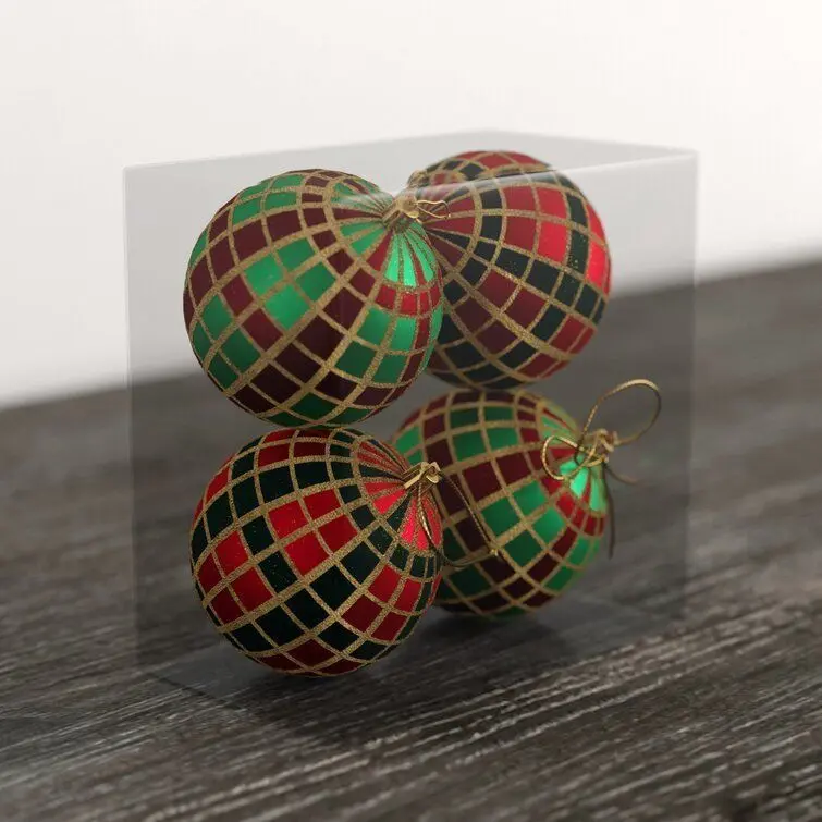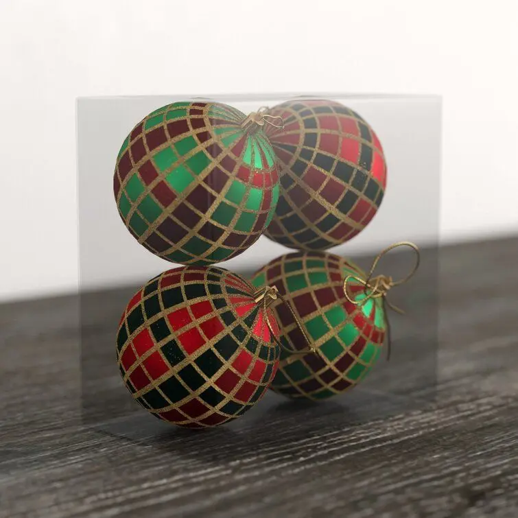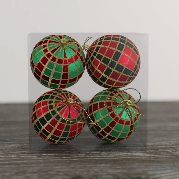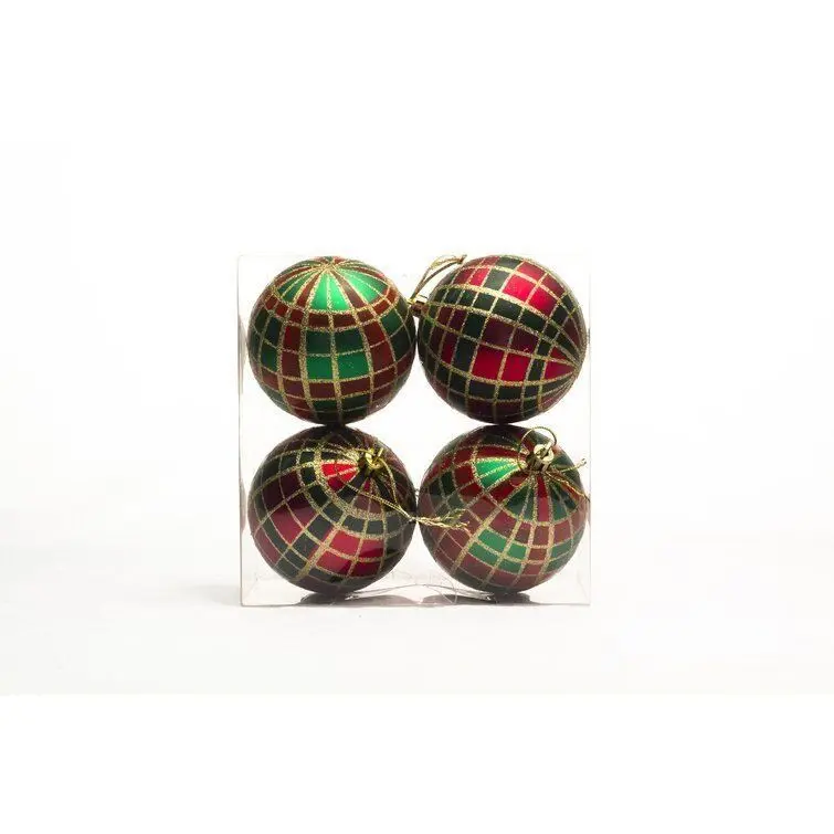 - Spruce up your Christmas tree in classic style with this set of four ornaments. Striking a spherical silhouette, each piece showcases a traditional plaid-inspired pattern in green and red hues for a festive feel. Gold glitter accents dress up the design with subtle shimmer.