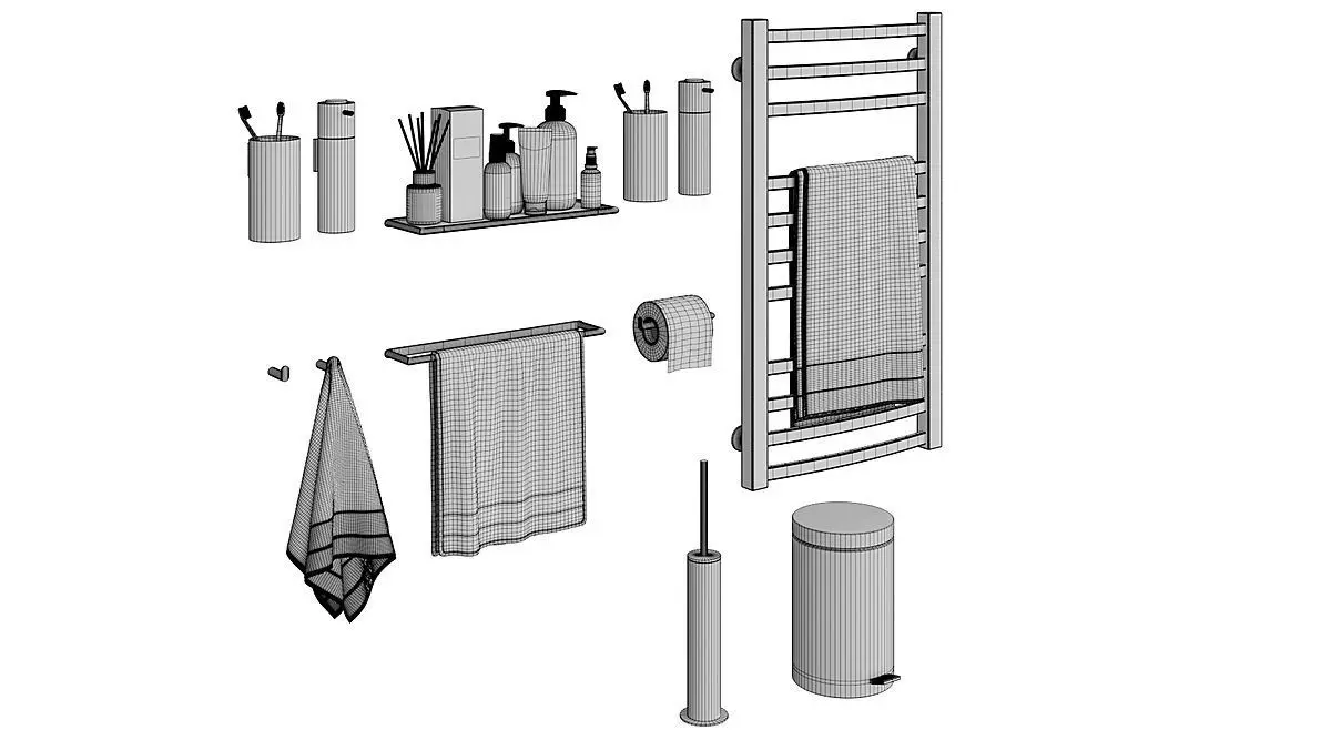 Decorative set for the bathroom. Bucket, brush, paper, heated towel rail, shelves, towels and decor.