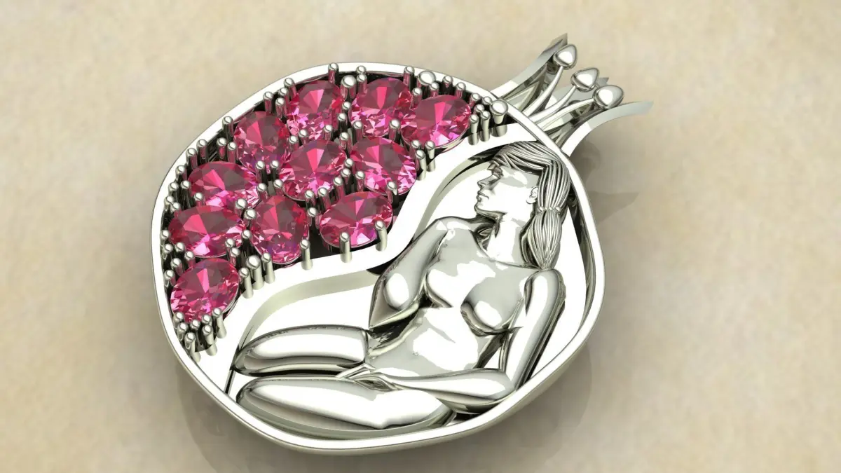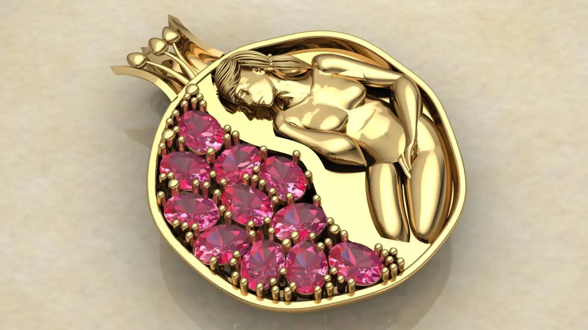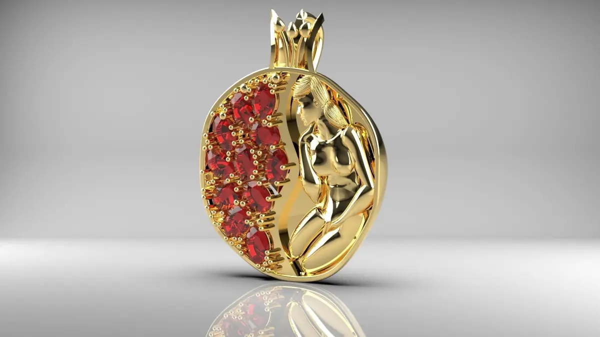 Pomegranate pendant in dimensions of 23 * 29 mm with oval gem with dimensions of 4 * 3 mm.
