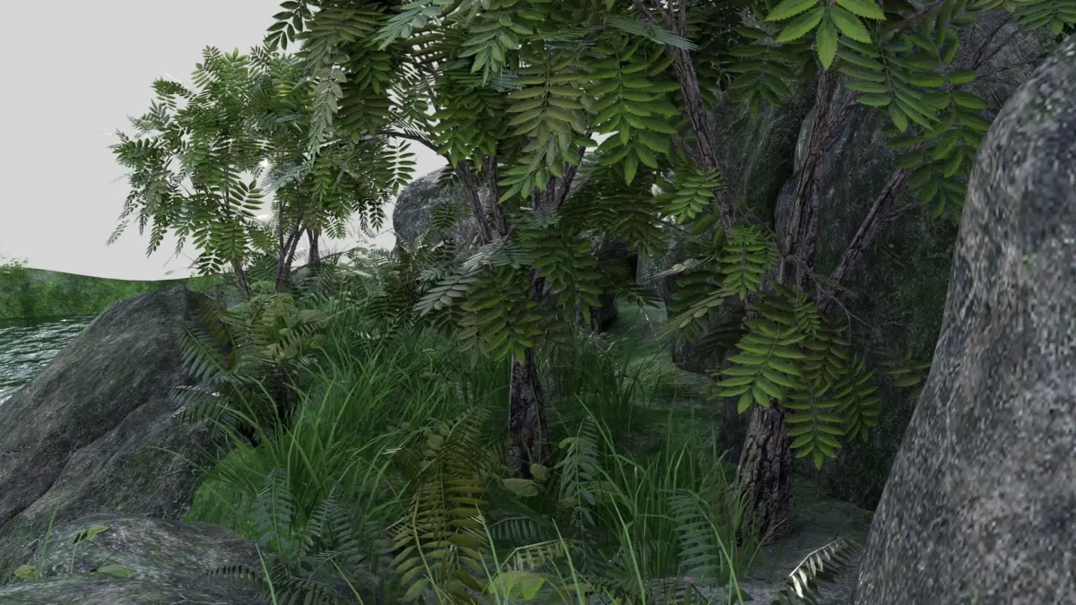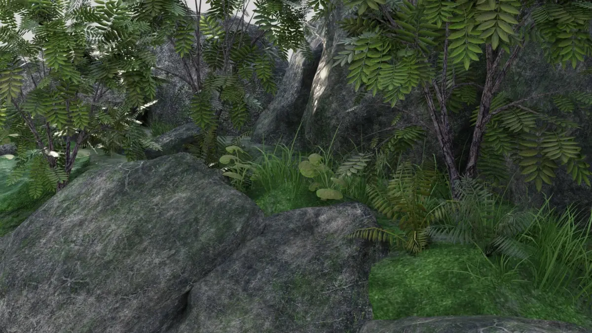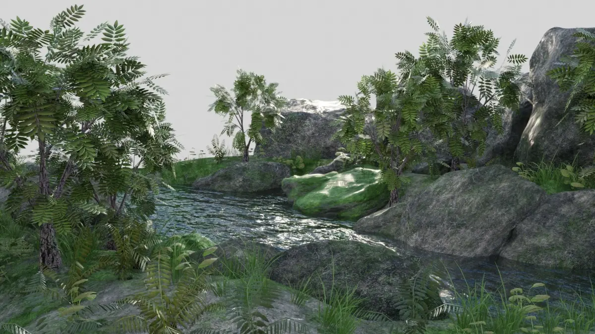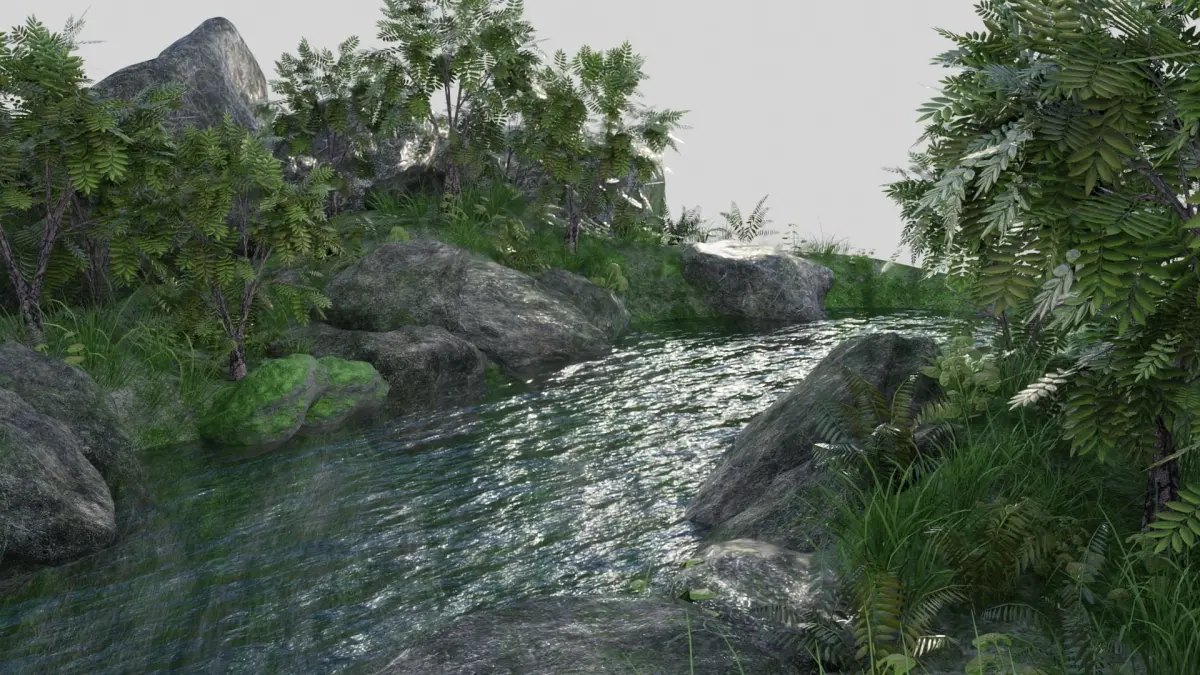 Texture: 2K ground Texuture 2048*2048 (Diffuse,normal, metalic and roughness map). Rocks Texture 2048*2048 (Diffuse,normal,AO, edge,smoothness and Height map).Mossy Rock Texture: 2048*2048 (Diffuse.Ao,matalic,normal and roughness). Plant 1: 2048*4096 (Diffuse). Plant 2: 2048*4096 (Diffuse). Plant 3: 2048*2048 (Diffuse).Grass: 720*1280 (Diffuse).Tree: Leaves 2048*2048 Bark 1024^1024.Water is cycles engine material.