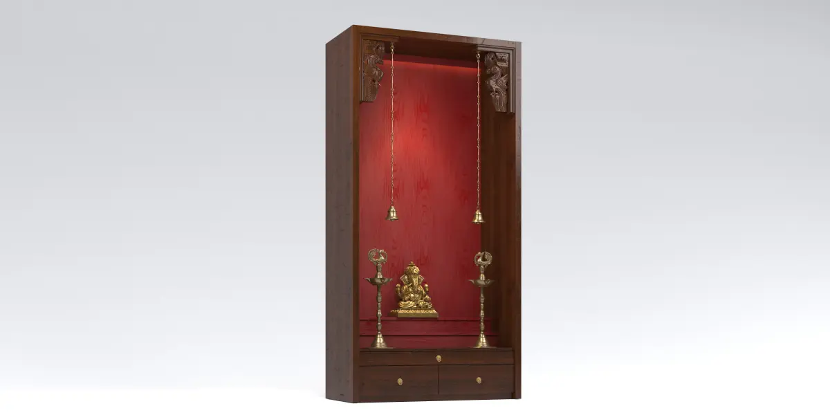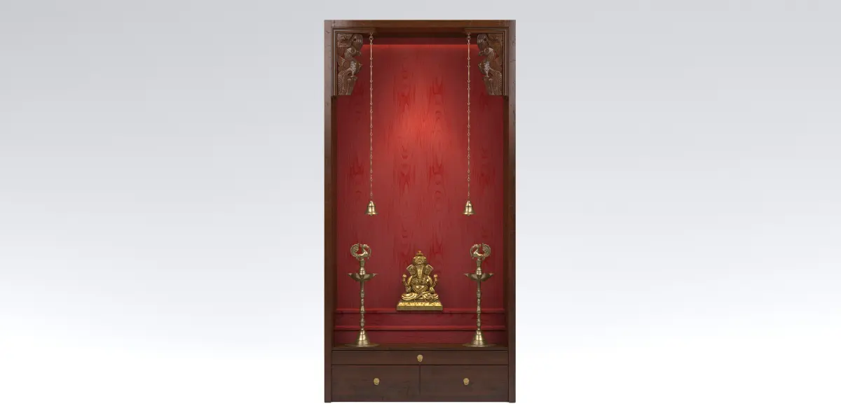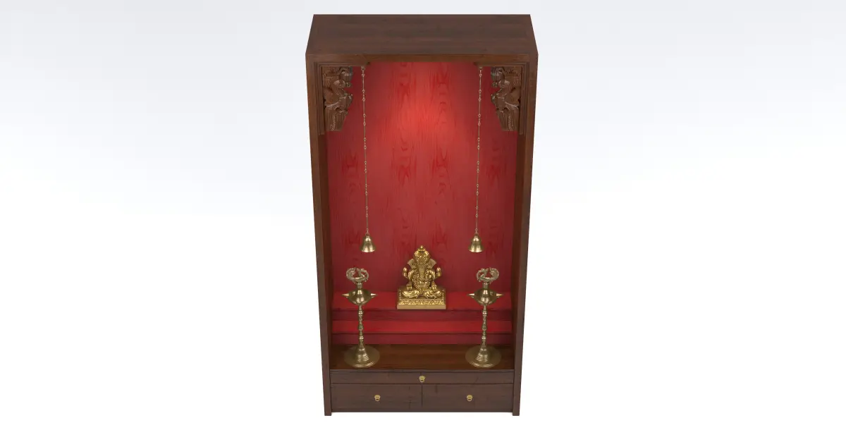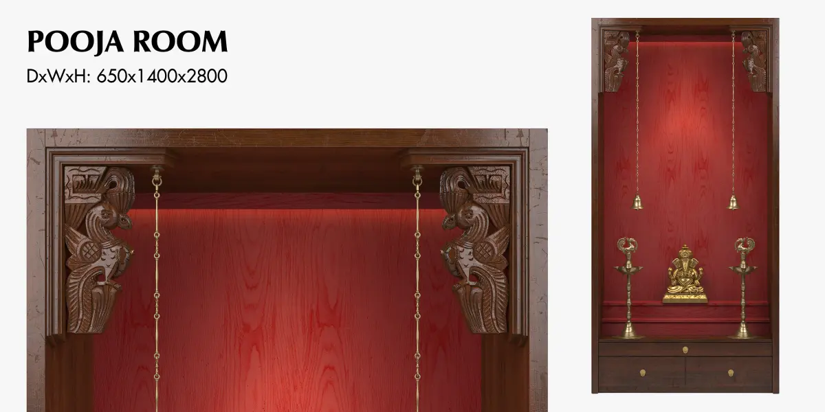 A pooja room, also known as a mandir, is a dedicated space within a Hindu home for prayer, worship, and spiritual practices. It's a sacred area where religious idols, images, and texts are kept, and where family members can connect with their chosen deities and find peace and positivity. The pooja room includes: a pair of parrot bodhil wall brackets, a pair of peacock carved oil lamps, a ganesha statue and a hanging bell