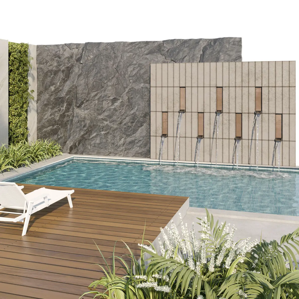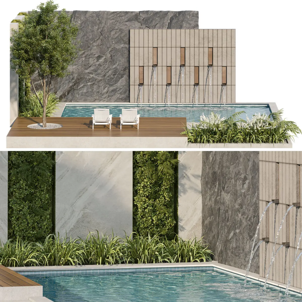 The model of a swimming pool is made with high qualityand details and looks great and you can use it in your projects,which combined with a waterfall and plants is very attractive and beautiful.