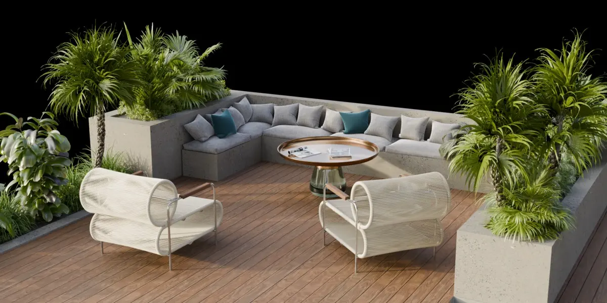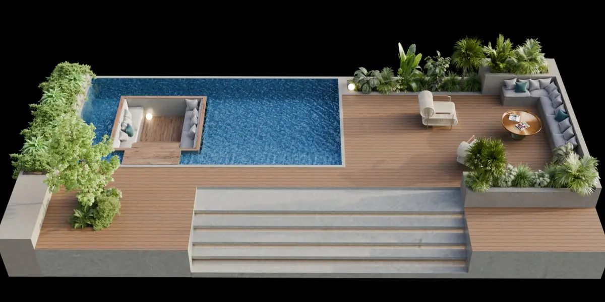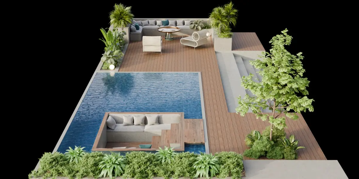 This scene is a luxurious outdoor space featuring a modern pool with an integrated sunken lounge area, surrounded by lush greenery and wooden decking. Comfortable seating and decorative plants enhance the serene, elegant atmosphere, creating a perfect setting for relaxation and leisure.