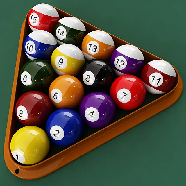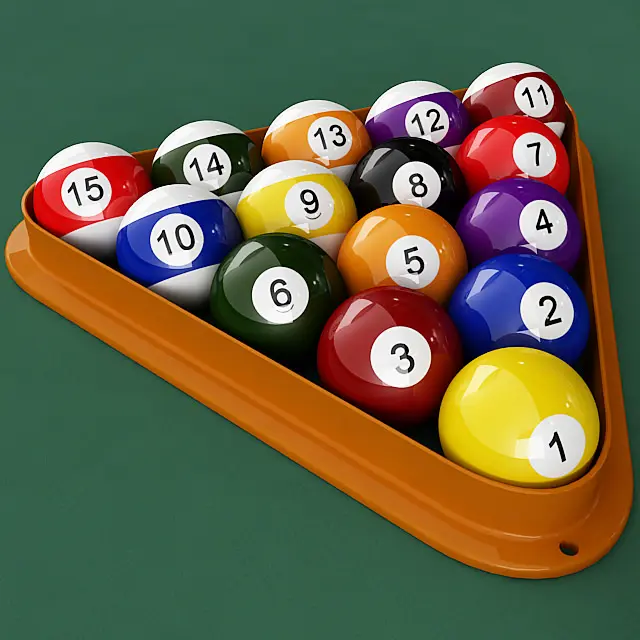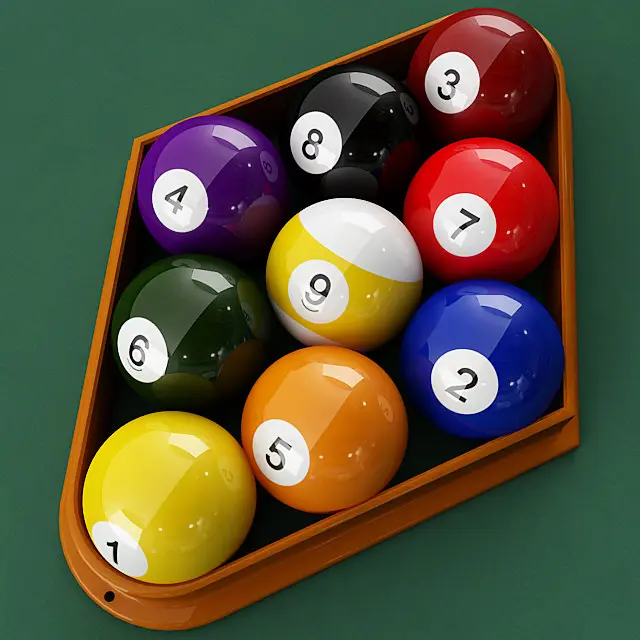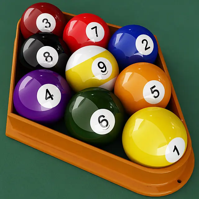 Pool Balls, 8 and 9 ball configurations, Cue Ball, 9 ball rack, and the 8 ball rack.