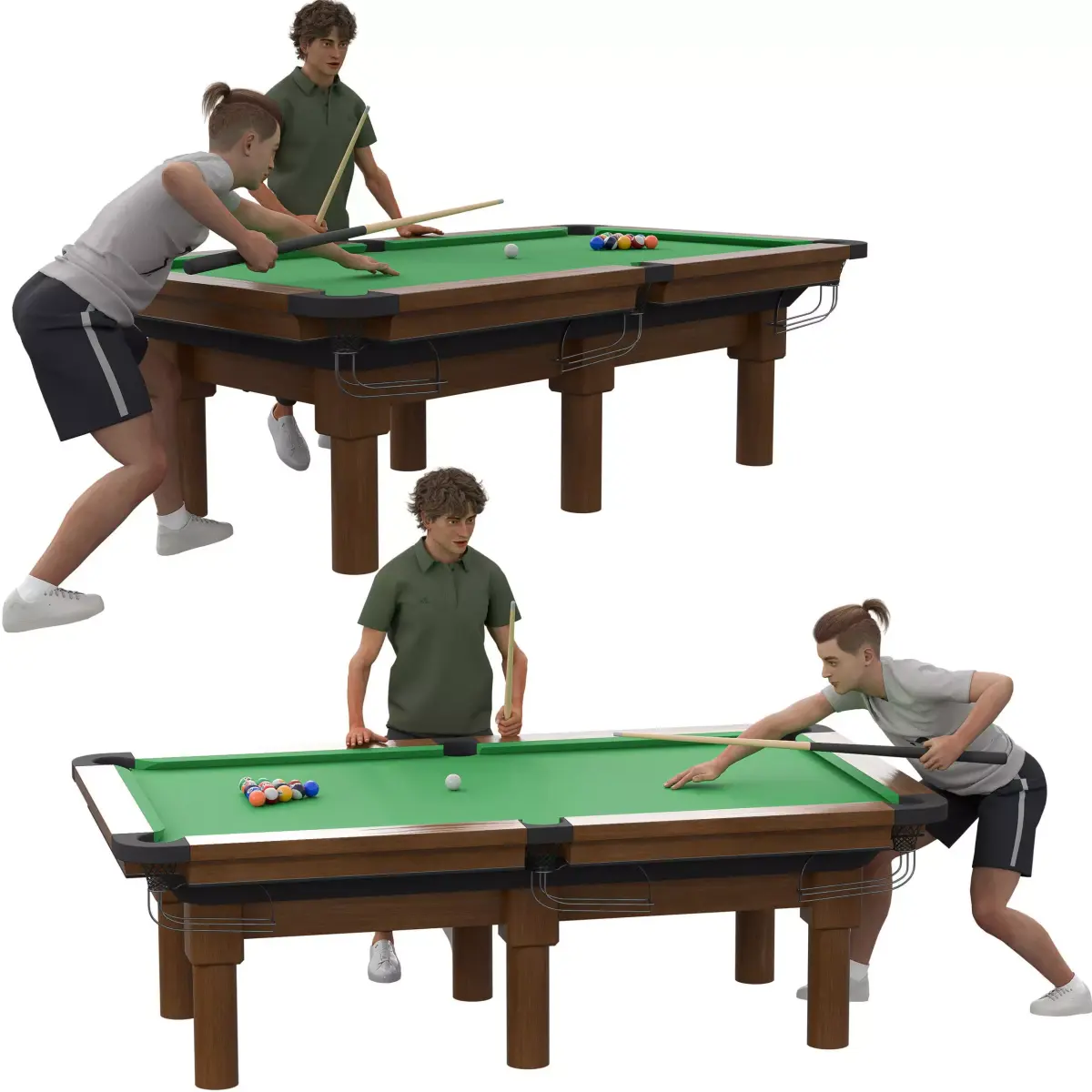 The model includes a highly realistic pool table setup with accurate cloth and ball materials, two fully posed/rigged male character models (created in Marvelous Designer), and all necessary props (cue sticks, racked balls). All components are organized, scaled to real-world dimensions, and ready for immediate use.
