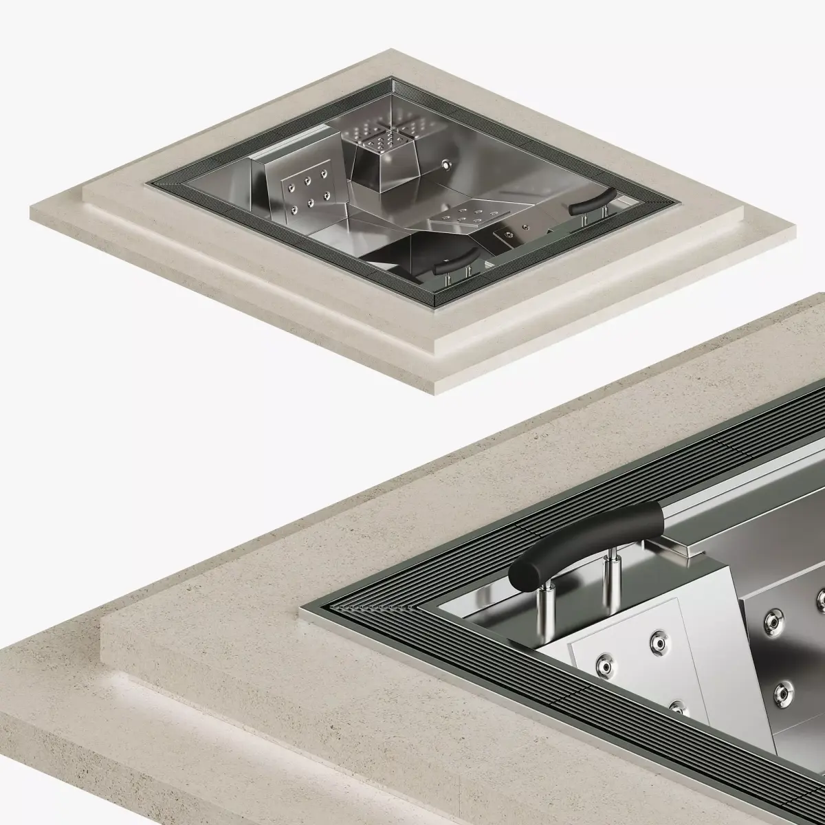 The Mercurio spa has 4 seats. Manufactured in one piece in satin-finish a thickness of 2 mm.It has 2 beds of corporal hydromassage, rubber headrest and 2 seats with hydromassage on the back and calves.Dimensions: 270 x 230 x 90 cm.