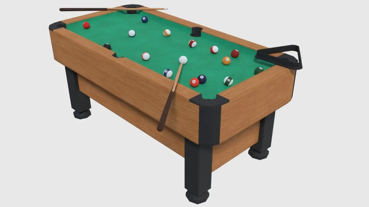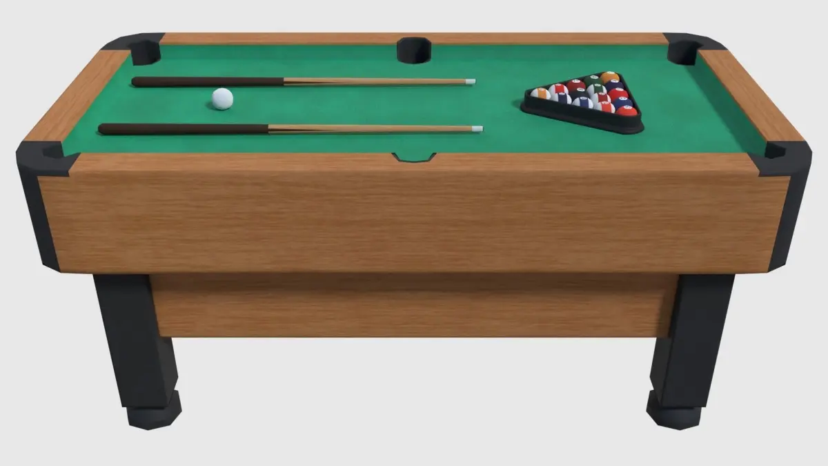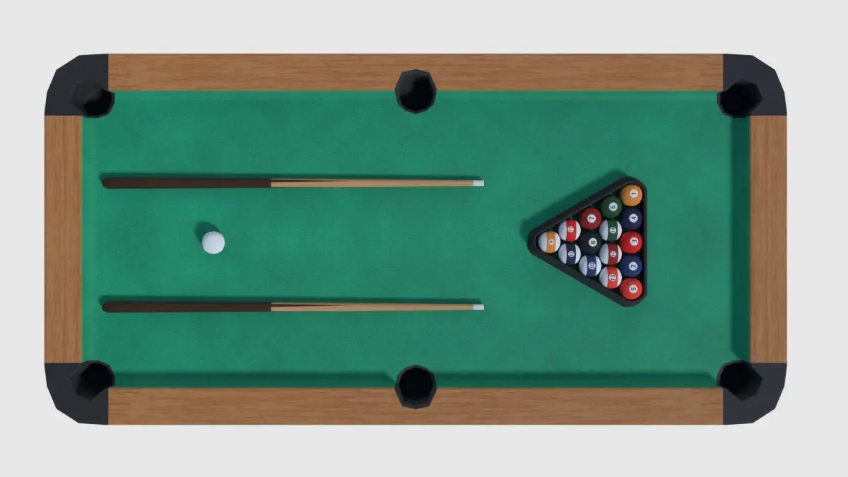 Pool table with cues, pool balls and triangle rack. Made in Blender and rendered with Cycles. Assets are in realistic dimensions measured in metres.